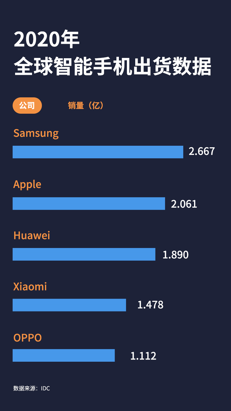 据权威市调机构IDC发布的2020年全球的智能手机销售数据显示,三星占据榜首,达成了2.667亿台销售,这也是三星从2012年超越诺基亚成为全球手机老大以来,连续9年占据了这一位置。