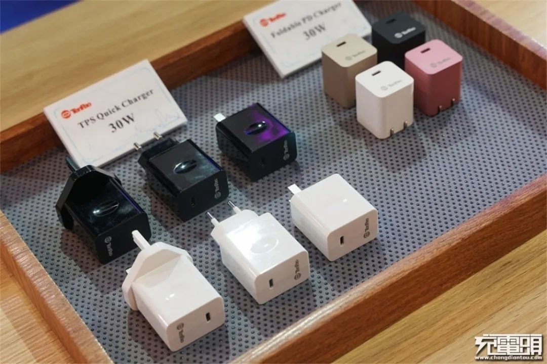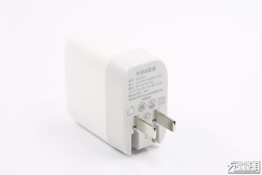 古石科技30W单C口PD快充充电器输出为5V3A、9V3A、12V2A、15V2A、20V1.5A,并支持PPS,可完美兼容苹果12、iPad pro、三星S21等手机PD快充。同时还能给笔电供电,该产品还已拿到PD3.0认证,TID编号为3736。中规美规为折叠型插头,可以使用英规/欧规可换插头,同时模具还有欧规直插多元化,充分考虑成本因素。目前这款充电器已经获得3C认证,海外其他认证等。