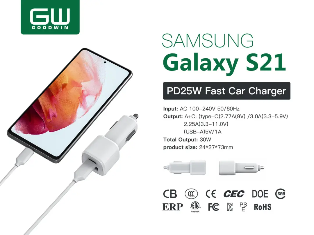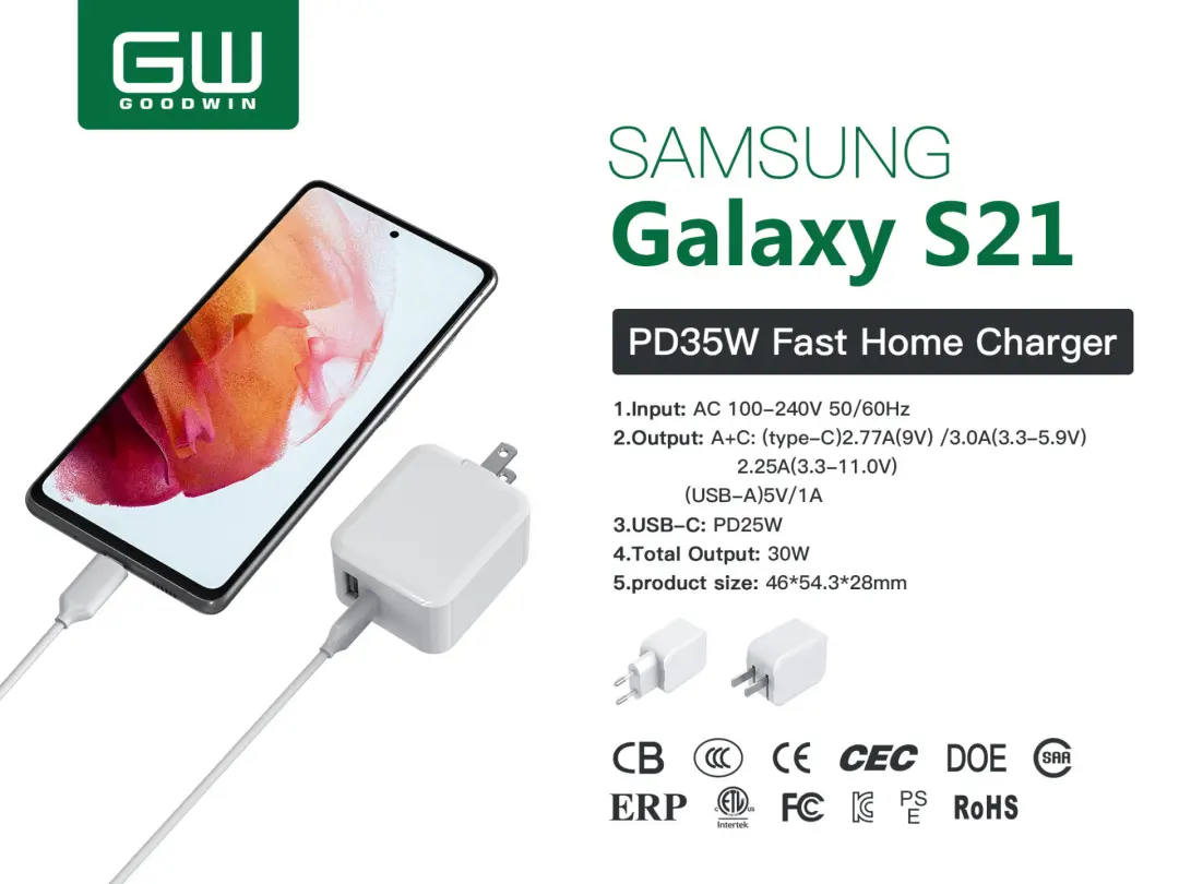 中正仁和针对三星S21不标配充电器推出一款总功率为30W的1A1C快充充电器,单口输出时,USB-C接口最大输出功率为25W,双口同时输出时,USB-C口仍能保持25W输出功率,USB-A口为5W输出。同时,充电器已经通过了CB、CE、FCC、RoHS、KC等多种国际认证,也根据客户的需求搭配不同规格的插脚,