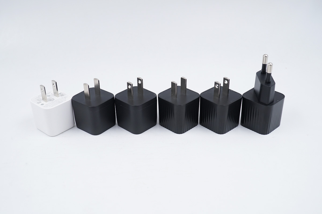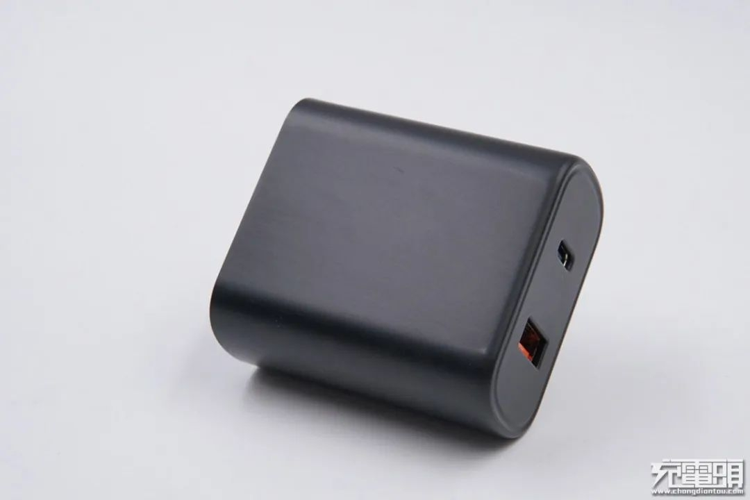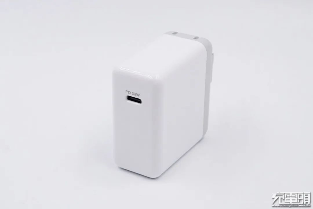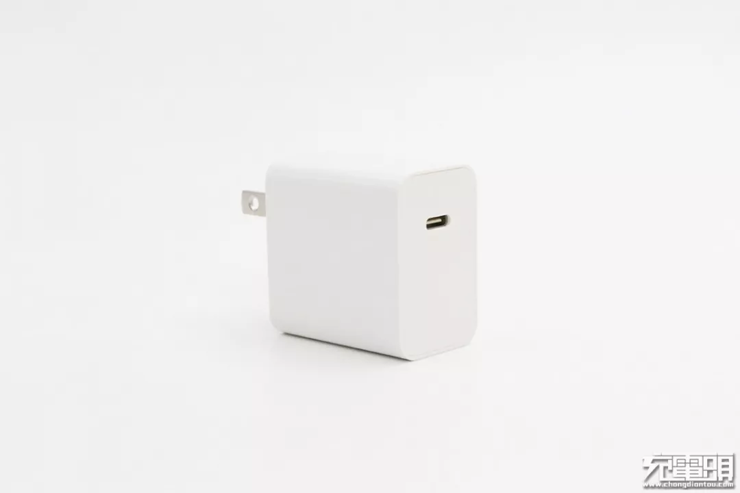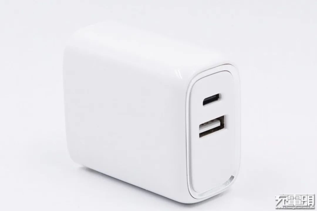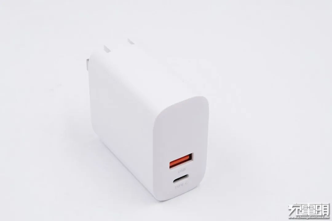 美富达30W USB PD充电器虽然没有采用氮化镓材料,但其体积同样非常小巧。该充电器采用单口USB-C输出,有黑白两种配色,插脚为不可折叠设计,机身部分长度与名片的宽度相当,功率密度很高。同时,这款充电器还有一个插脚可更换的版本,客户可以根据实际情况选配不同贵的插脚。