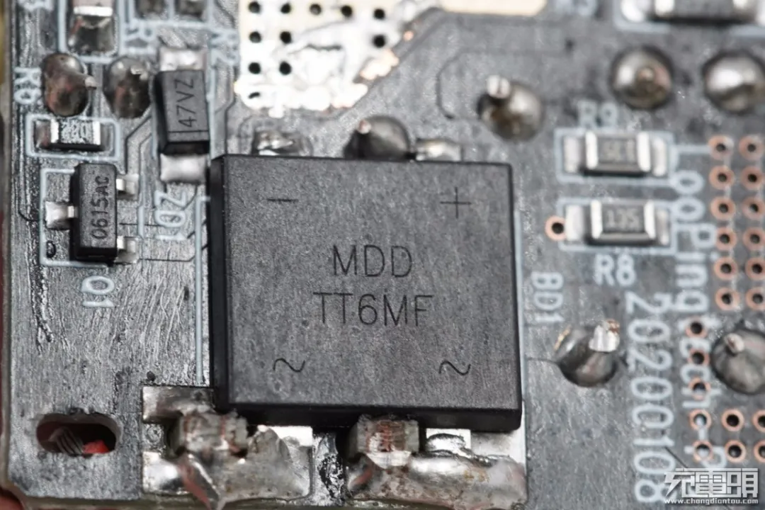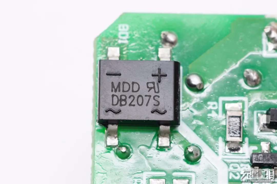 通过充电头网对这款充电器的拆解,我们看到输入端整流采用了两颗辰达行的MB40M整流桥,以半桥形式并联,均摊发热,避免温升集中。