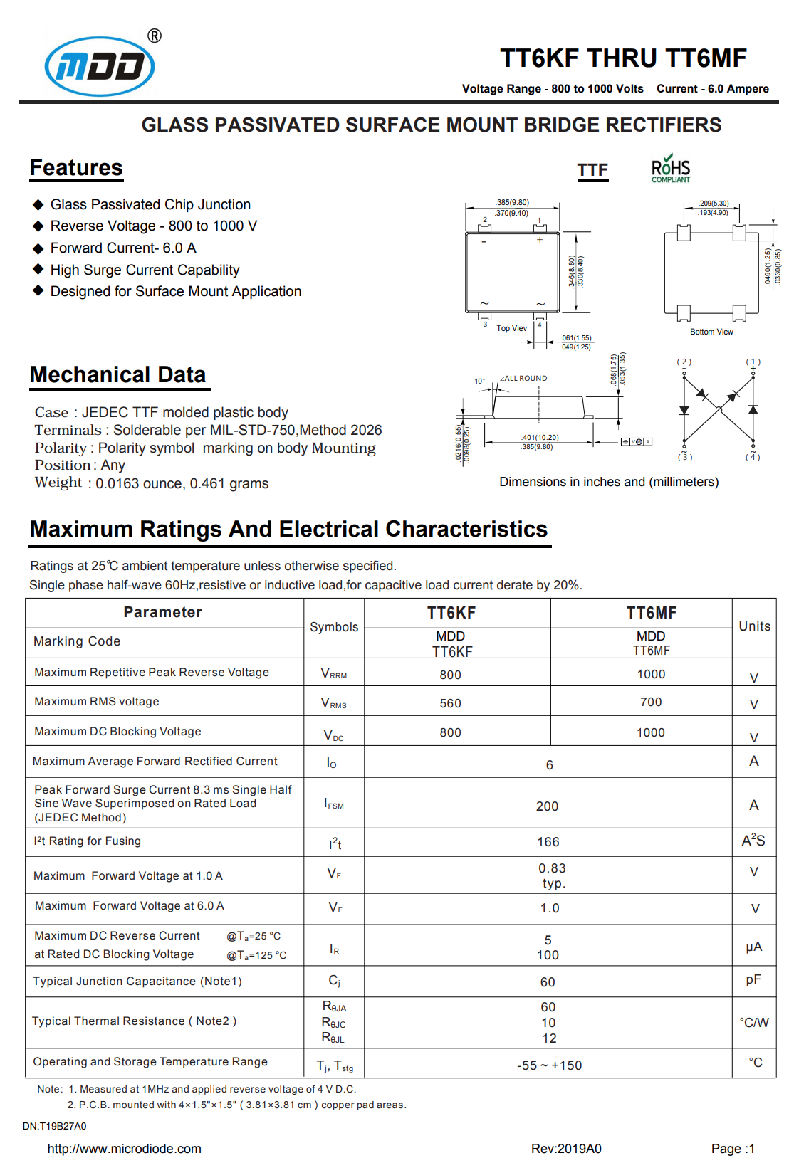 辰达行TT6MF整流桥耐压1000V,最大平均整流电流6A,峰值承受电流200A,额定电流下正向压降1.0V。支持-55℃到150摄氏度工作温度,是传统插件整流桥的理想替代品,降低厚度,减小体积,可在表面贴导热材料,易于整机散热设计。