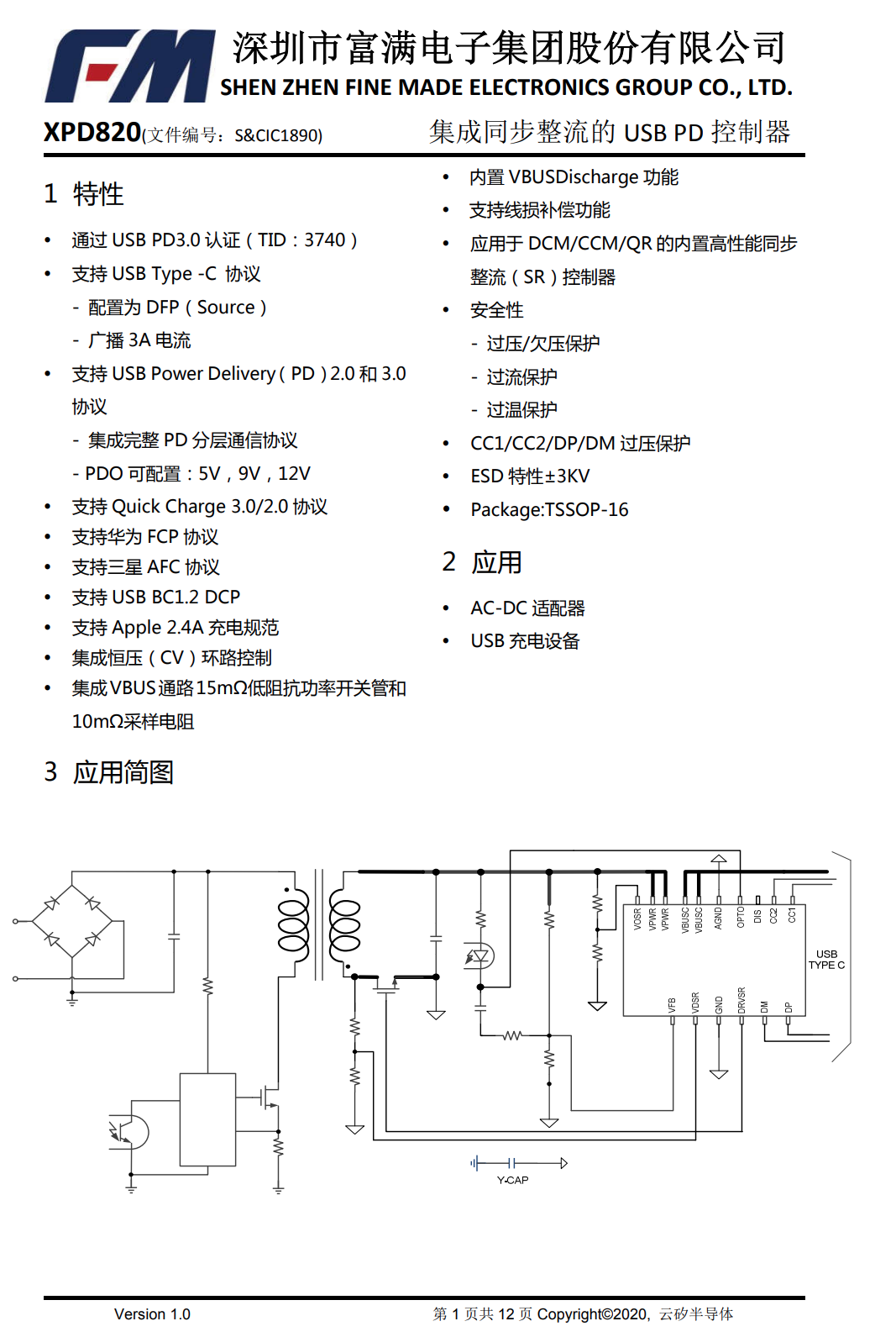 首先为大家介绍的是支持20W输出的XPD820,XPD820已经通过了USB PD3.0认证,TID:3740,最大支持3A输出电流,XPD820支持PD2.0和PD3.0协议,支持QC2.0/3.0、AFC、SCP、FCP等多种主流快充协议,芯片内部集成15mΩ导阻的VBUS开关管和10mΩ电流检测电阻,引脚支持过压保护,芯片内置完善的保护功能,内置的高性能同步整流控制器支持DCM/CCM/QR主流拓扑,兼容性非常好,适合PD快充适配器使用。