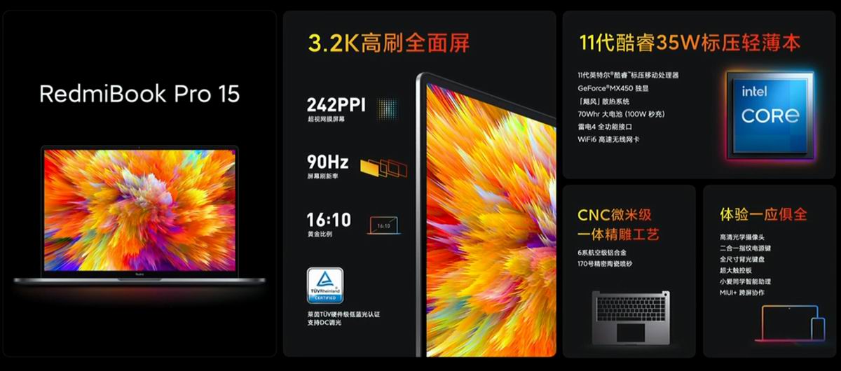 性能方面,RedmiBook Pro 15采用英特尔11代酷睿H35W标压处理器,MX450独立显卡,双6mm热管散热规模,拥有了超级本主流性能水准。