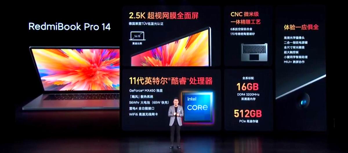 另有14英寸的RedmiBook Pro可选,搭载11代英特尔低压处理器,56Wh电池65W快充,同样搭载雷电4全功能接口,14英寸2.5K屏幕。