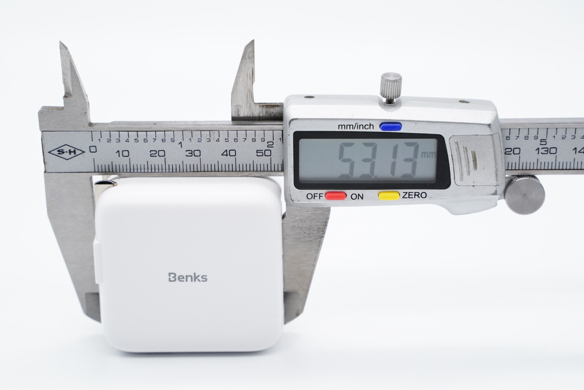 使用游标卡尺实测充电器机身长度为53.13mm。
