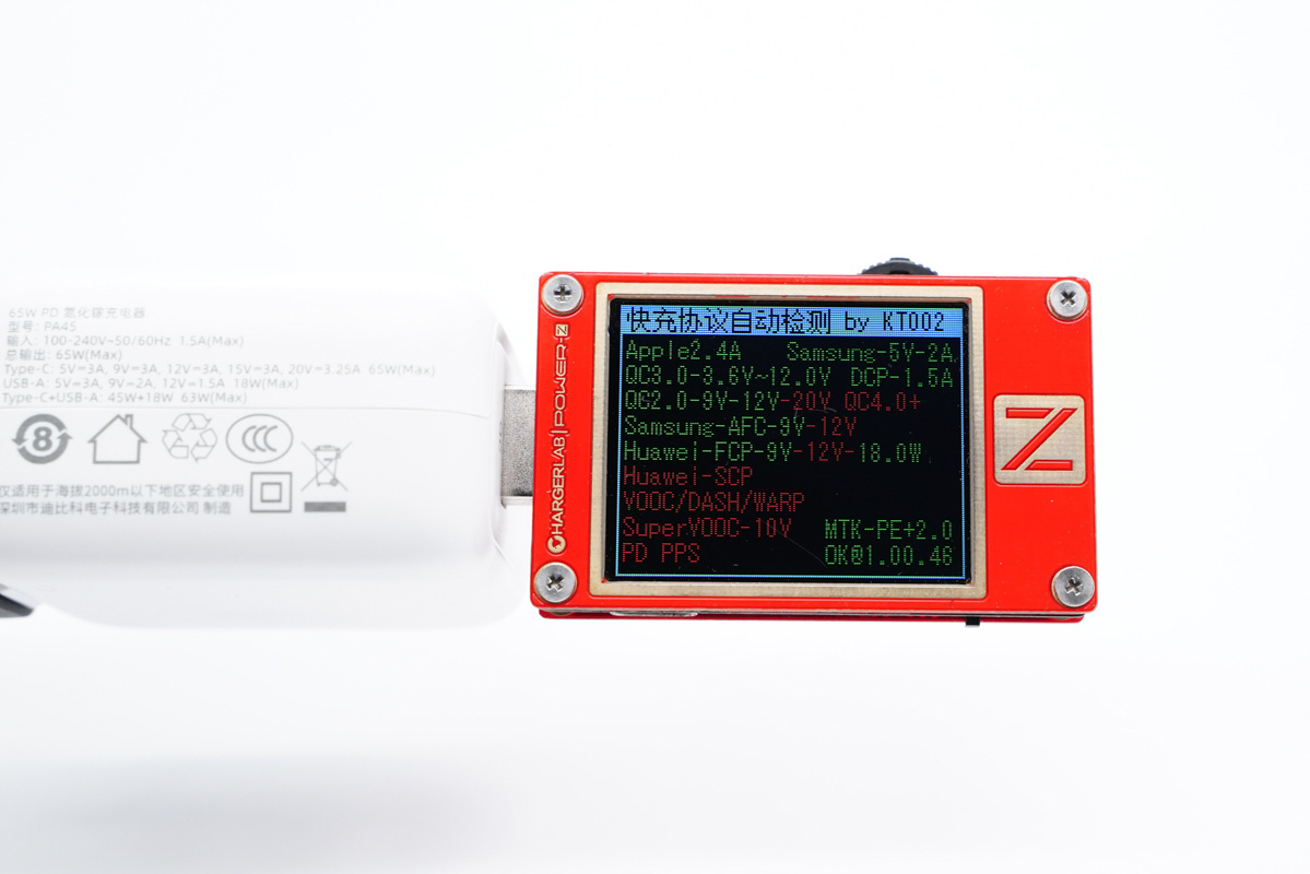 另外使用KT002检测USB-C口输出协议,显示支持Apple 2.4A、Samsung 5V2A、DCP协议,以及QC2.0/3.0、AFC、FCP、SCP、PE2.0、PD3.0快充协议。
