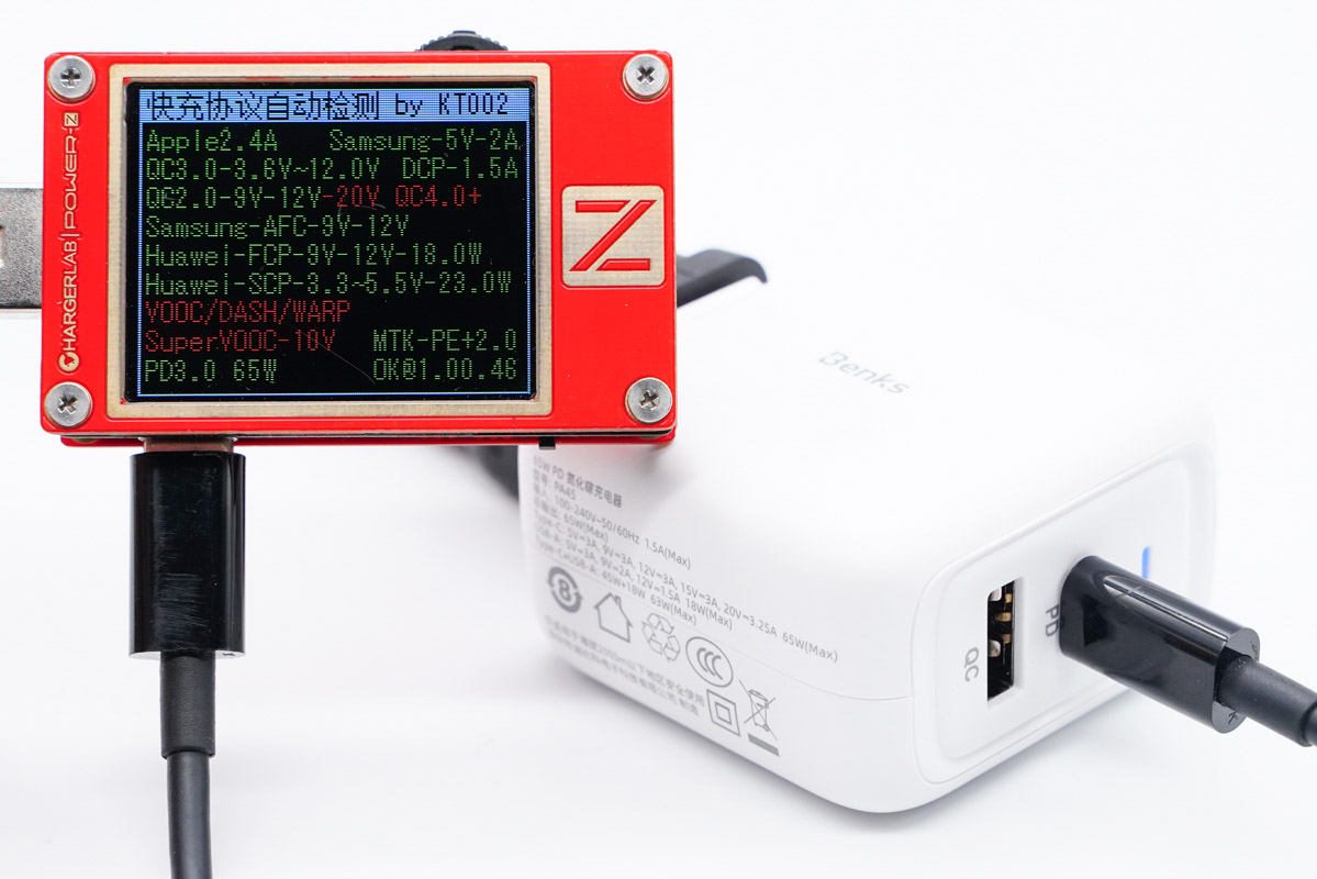使用ChargerLAB POWER-Z KT002检测USB-A口输出协议,显示支持Apple 2.4A、Samsung 5V2A、DCP协议,以及QC2.0/3.0、AFC、FCP、PE2.0快充协议。
