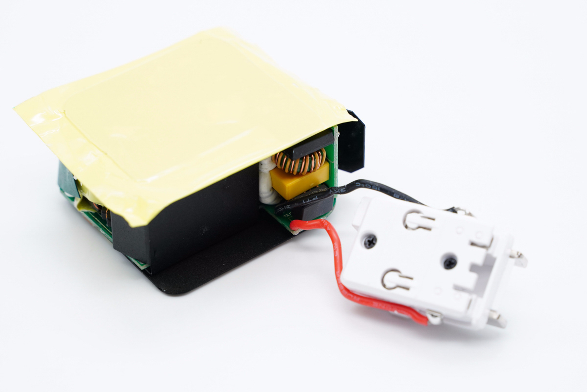 插脚和PCB板通过红黑导线连接通电,此外设有塑料板和电容隔离。
