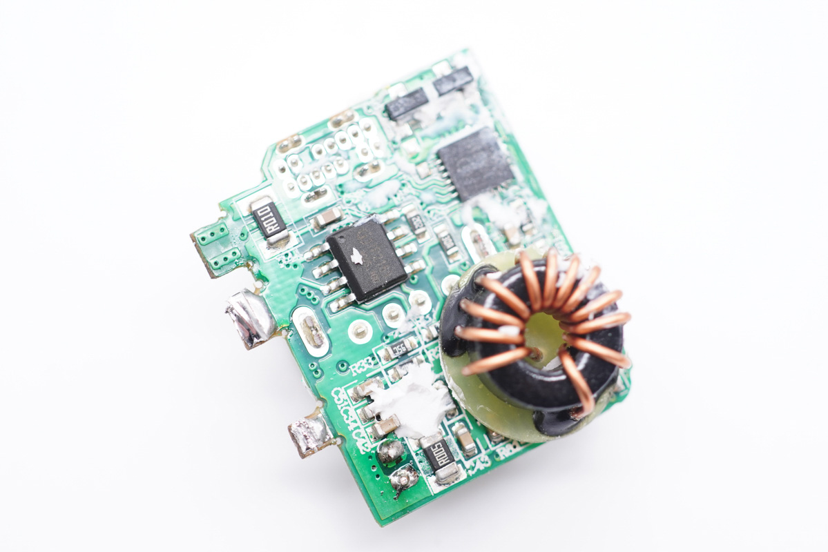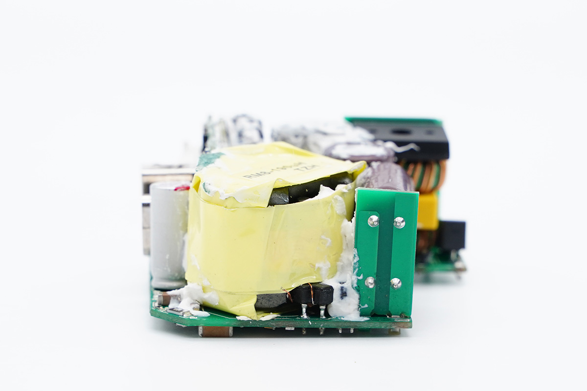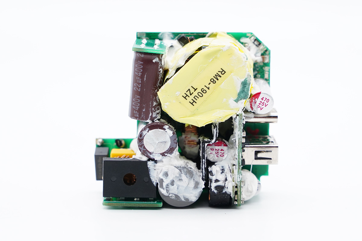 清理掉硅胶,光耦横跨在初次级之间,初级侧设有主控芯片和氮化镓功率芯片,次级侧设有同步整流控制器和MOS管。