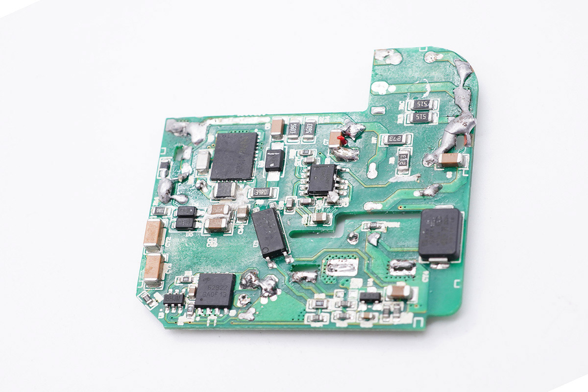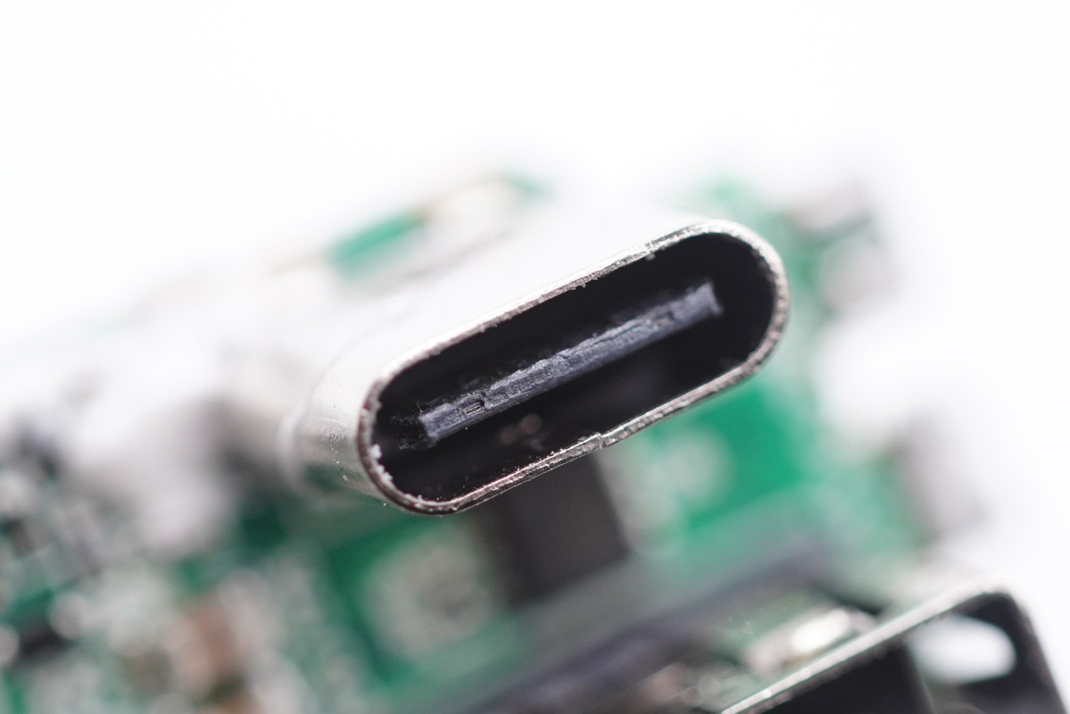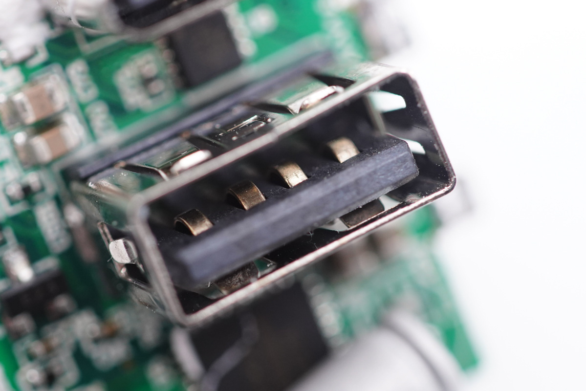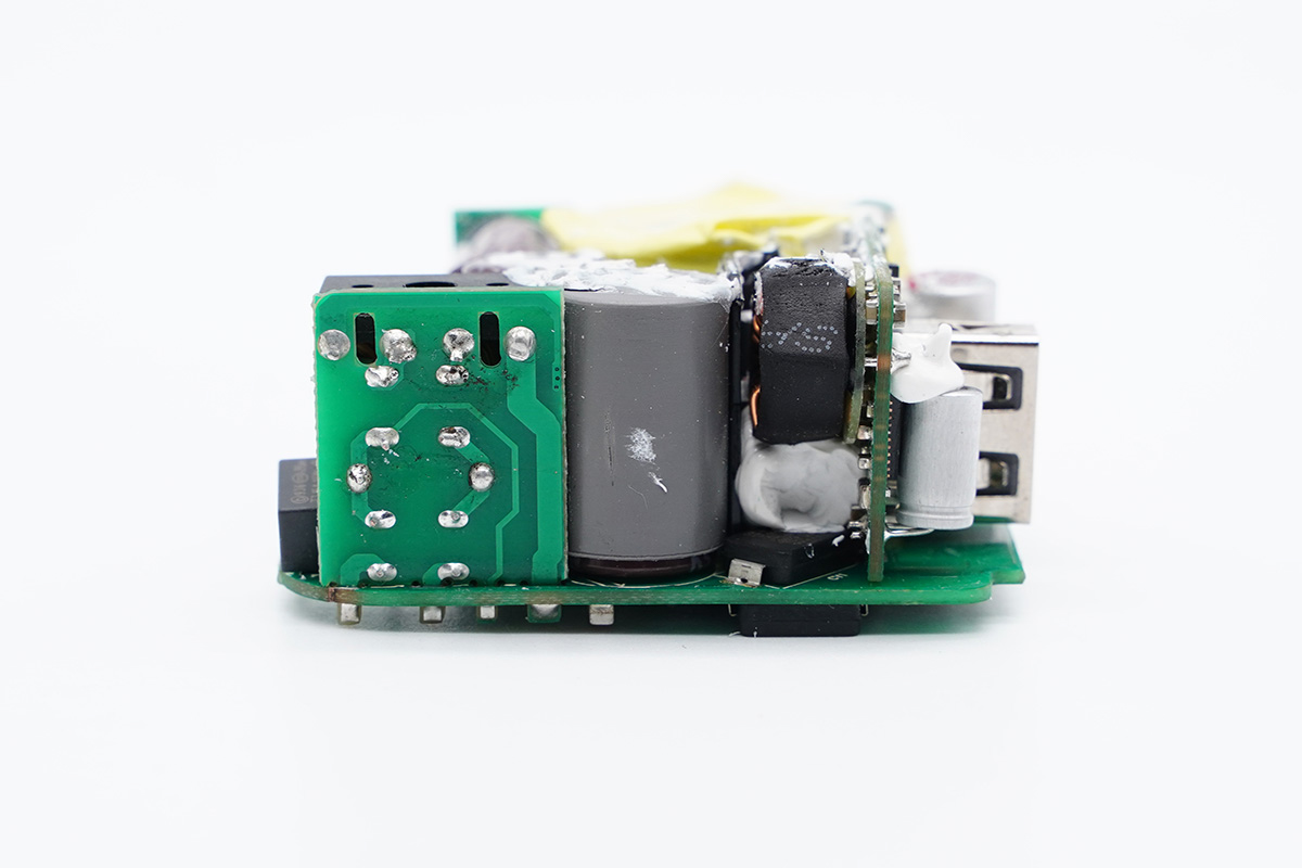 充电器输出端设有小板,USB母座垂直焊接在小板上,两颗滤波固态电容打胶加固。