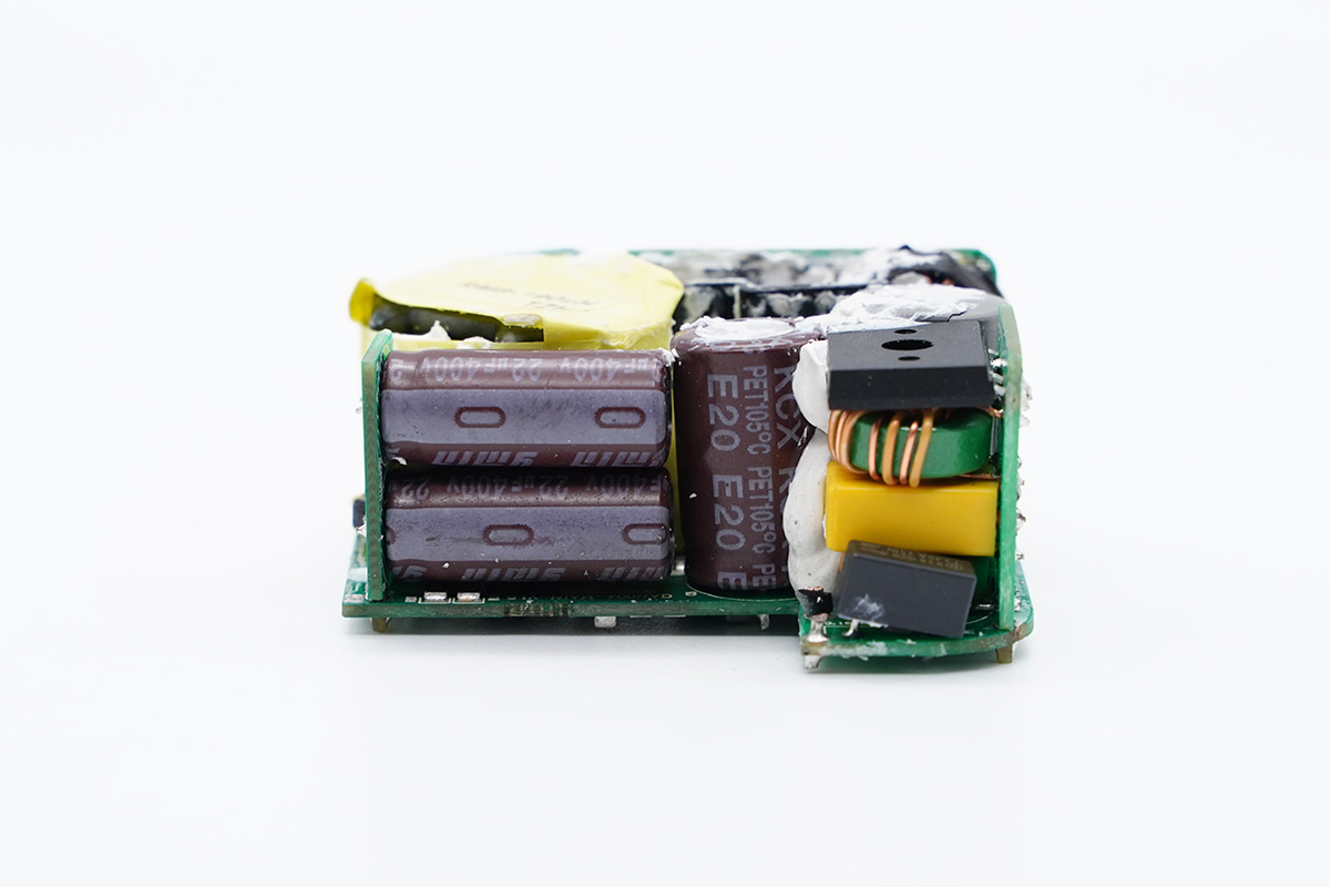 两颗电容为永铭KCX系列。这是永铭2019年推出的快充电源专用产品,其工作温度范围在-55℃~105℃,3000小时寿命,并具备抗雷击、低漏电流(低待机功耗)、高纹波电流、高频低阻抗等性能优势。