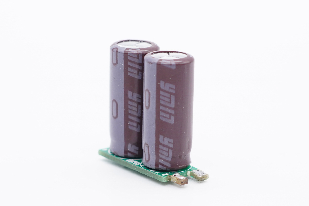 输出端设有小板,左侧有三颗高压滤波电解电容,一颗焊接在主板上,另外两颗则使用小板焊接。