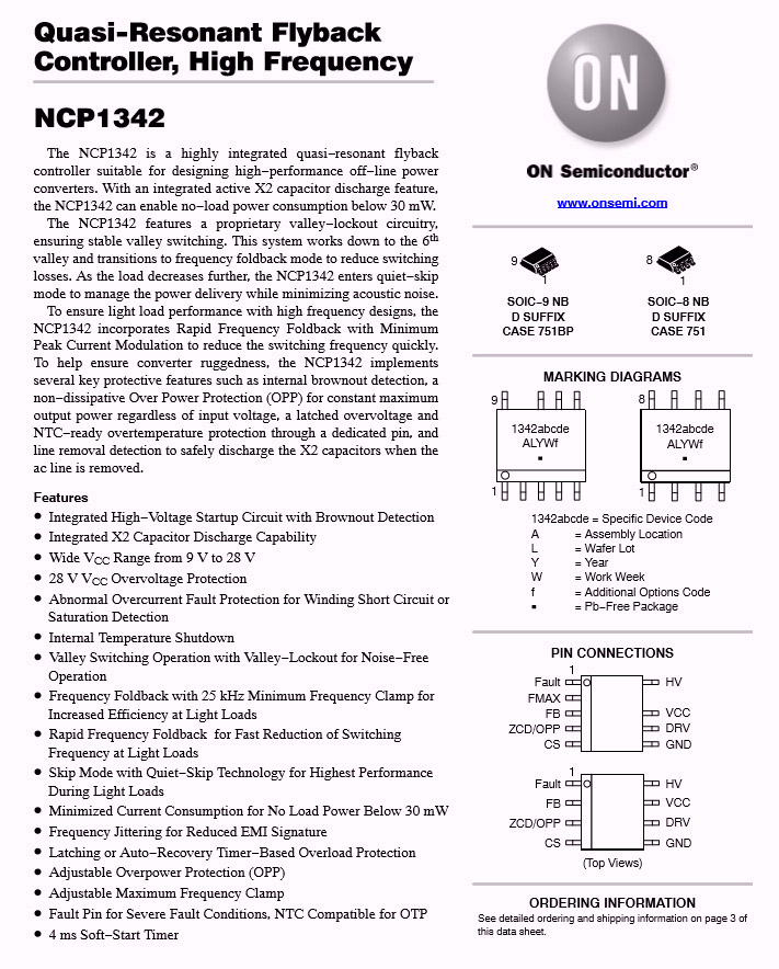 充电器主控芯片为ON安森美NCP1342,这是一颗高频初级PWM控制器,内置主动X2电容放电和多重完善的保护功能,具有超低的待机功耗。