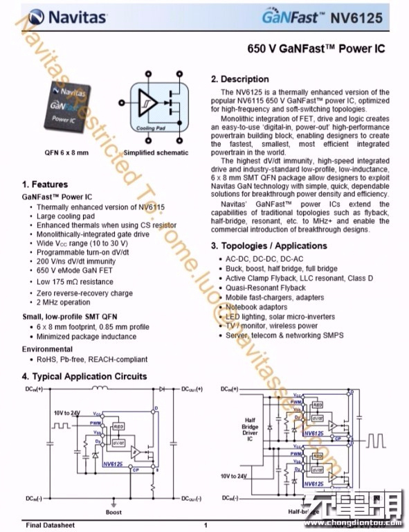 初级侧氮化镓功率芯片采用纳微NV6125,内置驱动器,无需外置驱动器,175mΩ导阻,耐压650V,支持2MHz开关频率,采用散热增强的QFN6*8mm封装,适用于升压,降压,半桥,全桥开关电源等诸多应用场合。