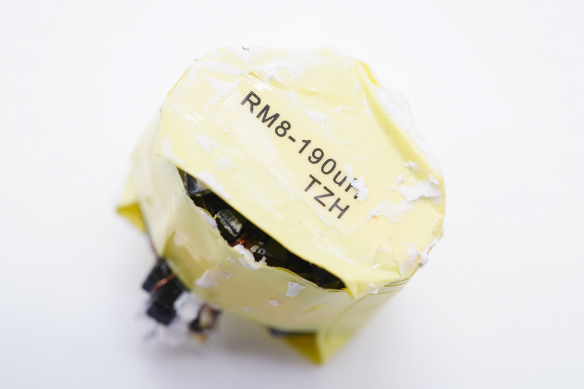 变压器特写,顶部贴有信息标签,采用RM8磁芯。