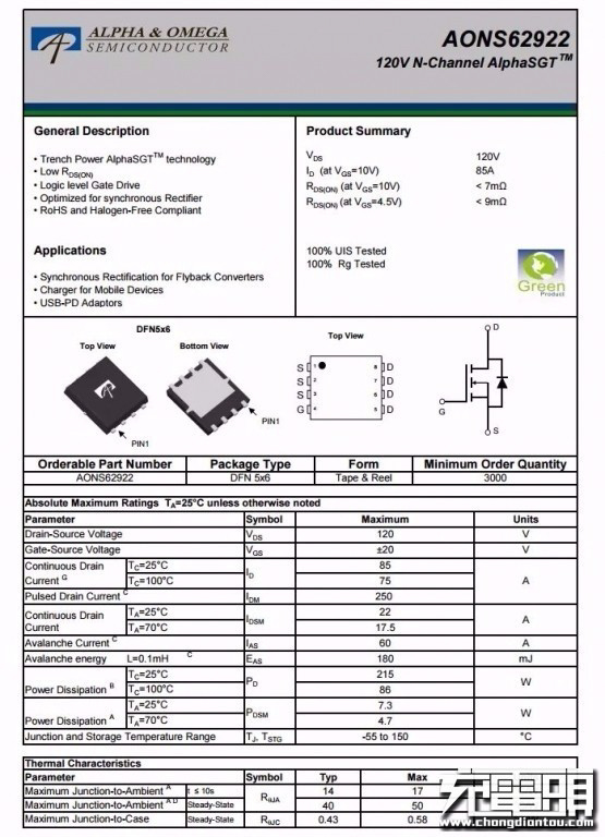 次级同步整流MOS管采用AOS万代的AONS62922,NMOS,耐压120V。