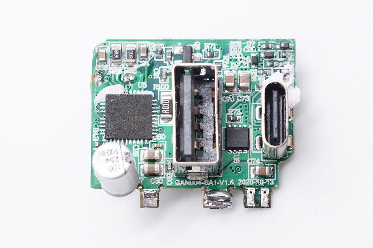 USB-C口协议芯片采用英集芯IP2723T。该芯片已通过USB IF协会PD3.0 PPS认证,TID:3135。是一款集成多种协议、用于USB输出端口的快充协议IC。支持多种快充协议,包括USB TypeC DFP、PD2.0/3.0、PPS 、HVDCP QC4、QC4+、QC3.0/2.0、FCP、SCP、AFC、MTK PE+ 2.0/1.1、Apple 2.4A、BC1.2以及三星2.0A。为适配器、车充等单向输出应用提供完整的TYPE-C解决方案。