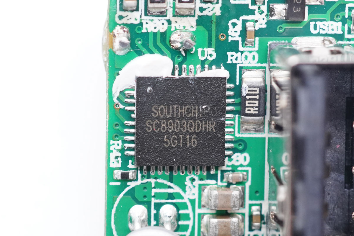 USB-A接口采用南芯半导体的同步升降压芯片SC8903进行电压转换。该芯片是一颗内部集成四管H桥的高效率同步升降压转换器,支持最高24V工作电压,支持动态输出电压控制,开关频率可调节,具有可编程的输入和输出电流限制,支持多种保护功能。