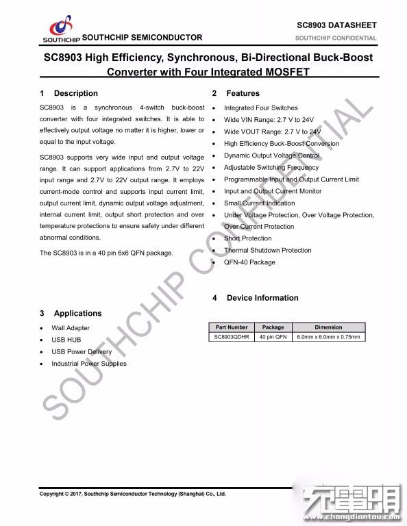 南芯SC8903规格资料。充电头网了解到,南芯SC8903此前已被Anker PowerCore Fusion PD超级充MOMAX 66W USB PD充电器等产品采用。