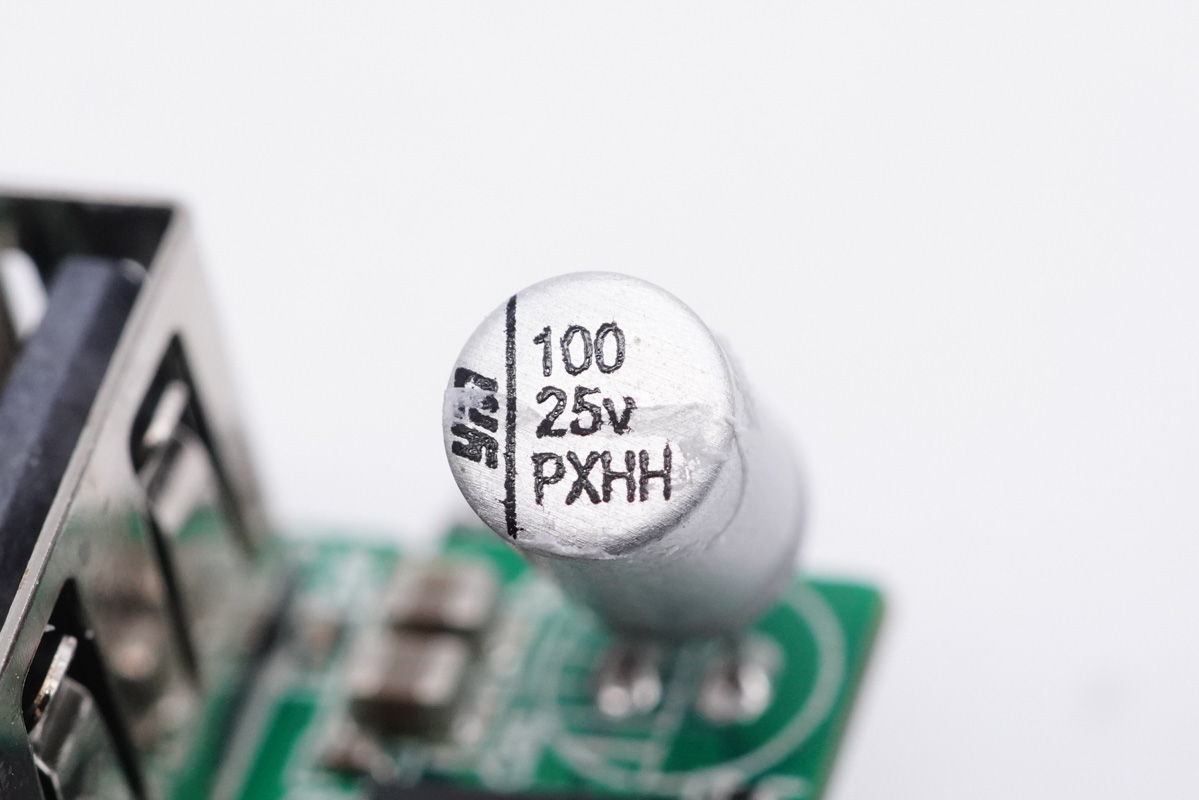 USB-A口输出滤波固态电容,永铭NPX系列,规格为25V 100μF。该系列电容具有小体积、低ESR、高容许纹波电流、高可靠性等特点。