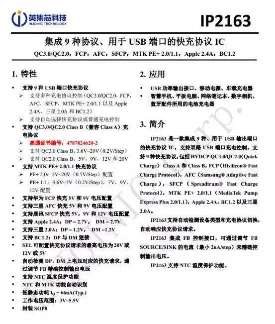 英集芯IP2163详细资料。充电头网通过拆解了解到,采用英集芯IP2163协议芯片的产品还有小米9手机27W原装充电器、魅蓝M20双向闪充移动电源、海韵 QC3.0快充电源适配器等。