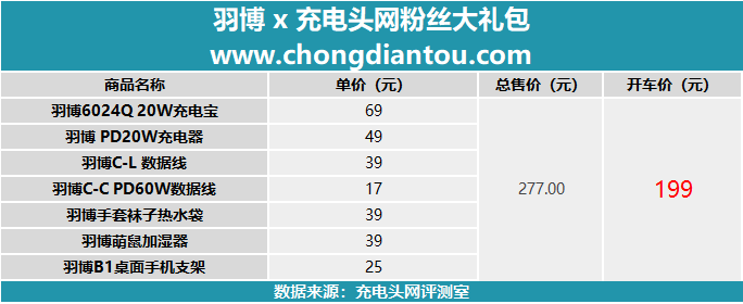 简单说,羽博大礼包里有20W PD充电器,一条C2l线材,一条C2C线材还有一个支持安卓苹果双快充的20W PD充电宝,基本满足手机用户的居家生活需求;而桌面支架可以调整手机、iPad的姿势,为健康考虑也是需要的;暖心礼物成双成对热水袋、细节到位萌鼠加湿器可以大大提高生活舒适度,属于买了都说好那种。这么多贴心产品官方售价280.9元,今天充电头网开车价199元,现在不下单还等啥?