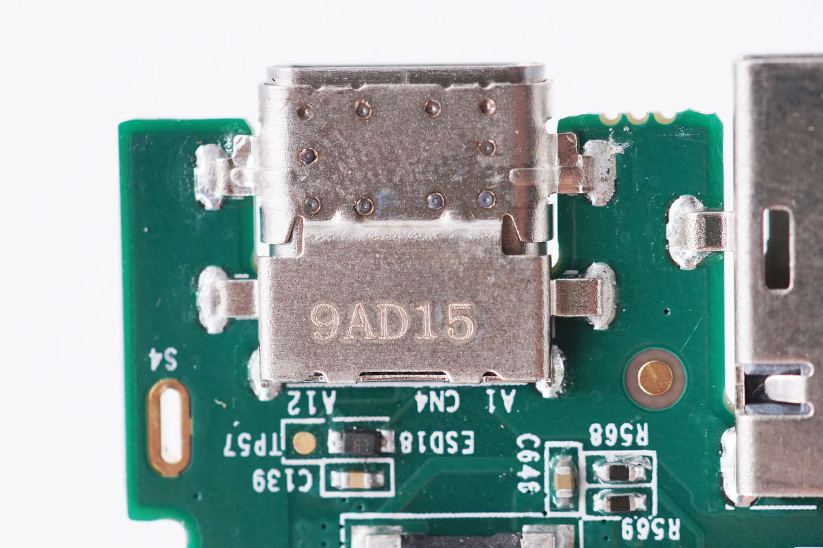 USB-C母座外套金属壳点焊加固,并刻有9AD15字样。