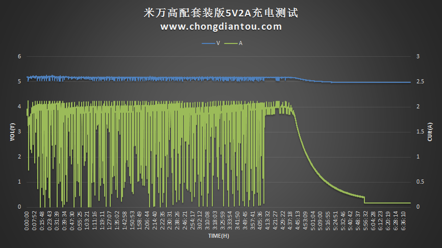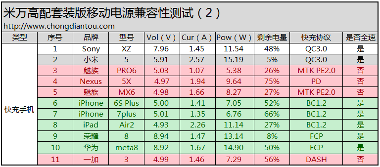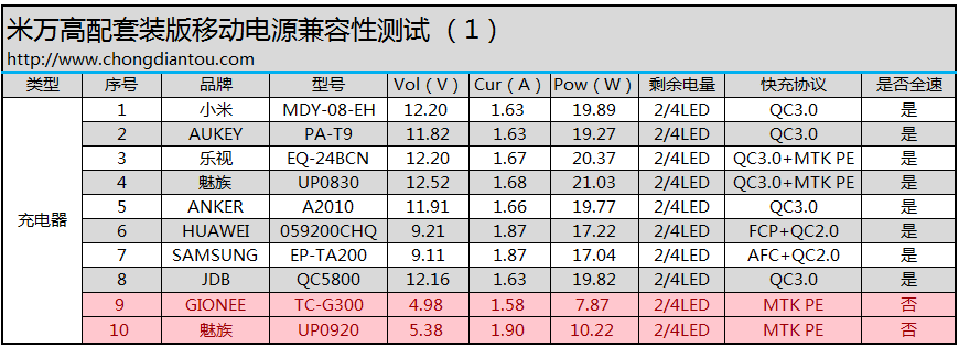 mtk PE2.0等快充充电器分别为半电状态的小米10000mAh高配套装版供电,最大功率可达21W,意味着2个小时即可充满,的确是耗电大户,一般的充电器很难满足它。从之前的兼容性测试列表可看出小米10000mAh高配版仅支持QC快充。