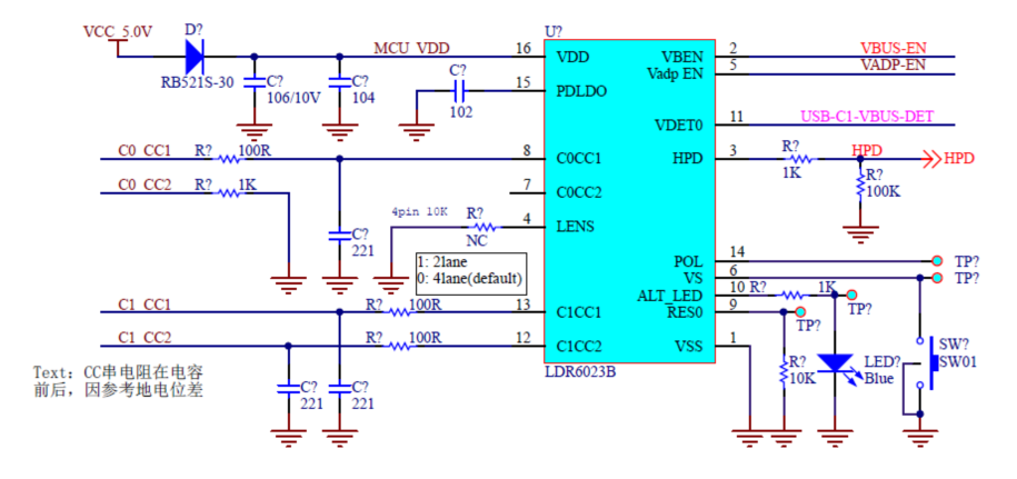 这颗芯片,不仅仅能够实现让任天堂SWITCH输出视频,还具有跟原装底座一样的DP Alt mode指示灯。即一旦SWITCH游戏机,通过USB PD通信协议沟通,进入了输出视频的模式,LDR6023B的pin10,ALT_LED信号就会输出高电平,点亮LED指示灯。 为了方便一些底座通过按键来控制SWITCH不要进入Alt mode,该芯片还有个神奇的VS pin,这个pin可以接一个到地的按键,每按一次,就会在进入Alt mode和不进入Alt mode之间进行切换。方便用户自由控制是把视频输出到电视,还是把画面保留在SWITCH屏幕上,底座仅仅提供充电功能。简直是太贴心了。这款芯片同样有着非常简洁的应用电路。