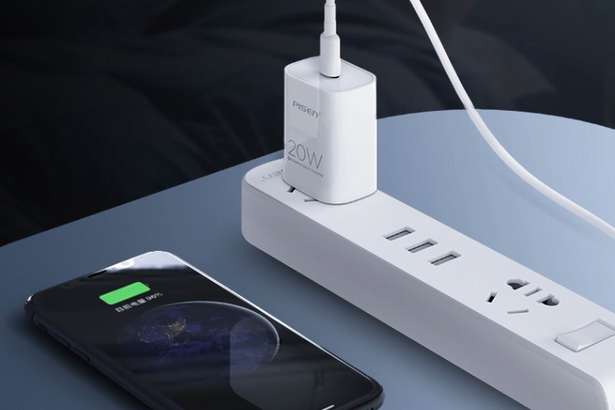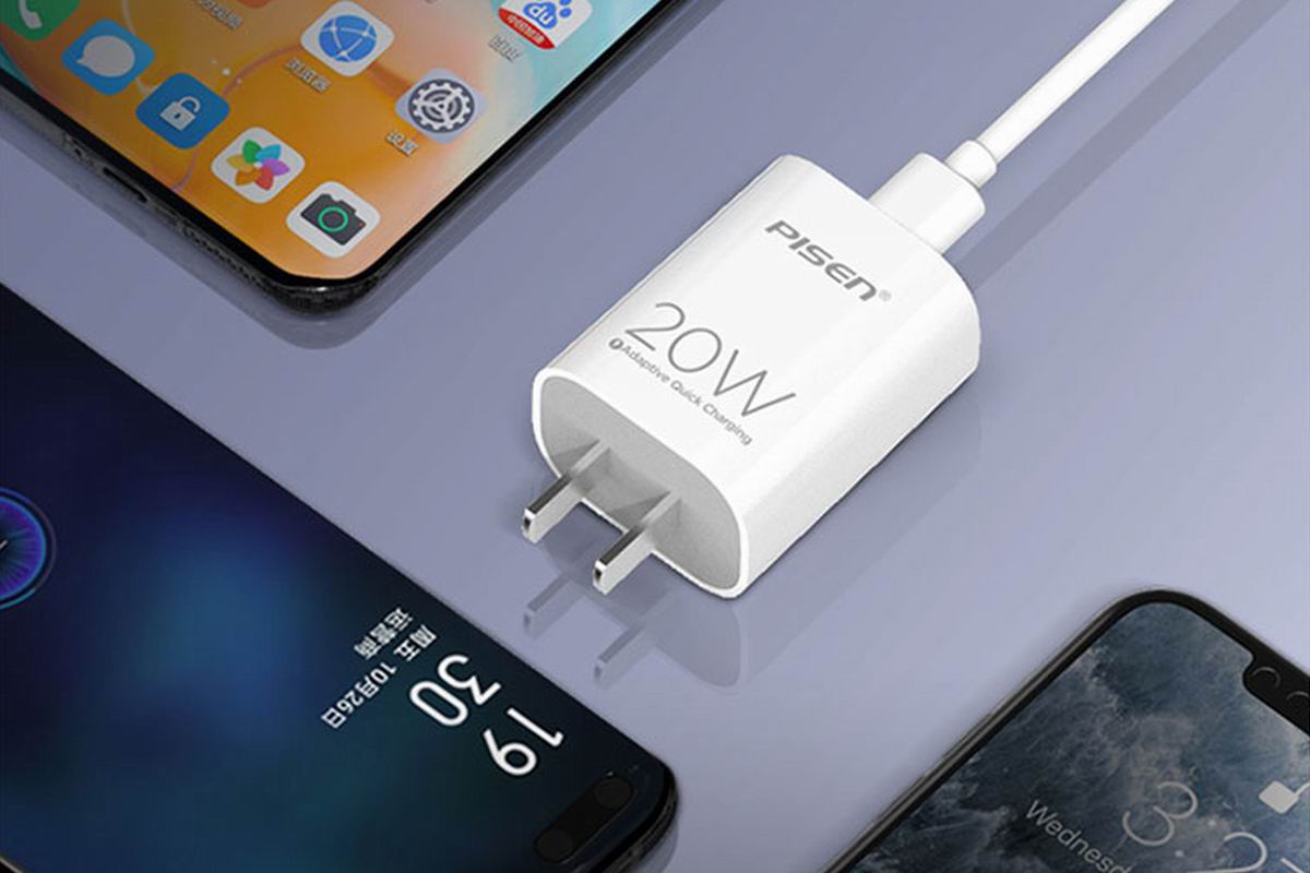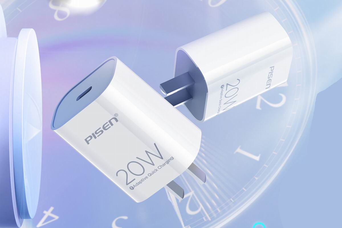 品胜20W PD充电器详细型号为TS-C135,壳体采用PC防火材质制作,白+灰搭配表面光面处理与苹果原厂20W充电器接近,印有品胜商标“PISEN”与20W快充标识,固定两脚插脚设计。