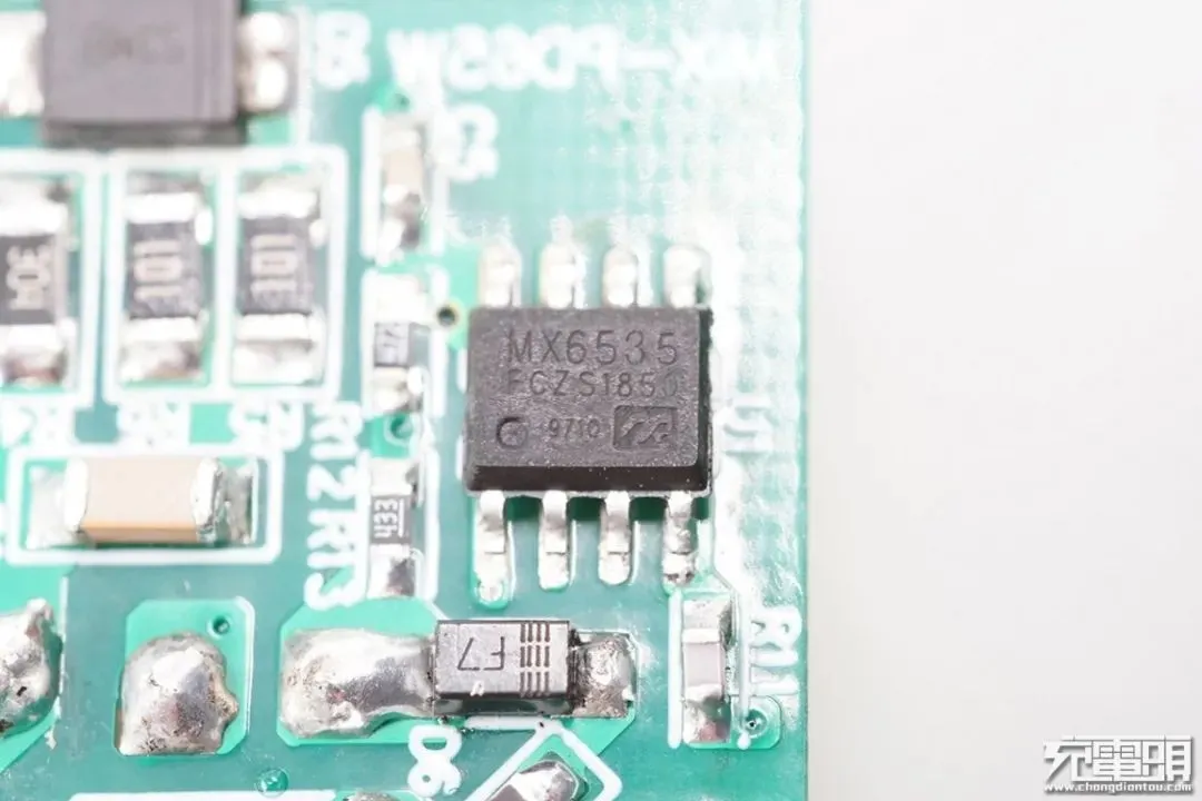 美思迪赛MX6535搭配自家的次级芯片可以实现超精简超高集成度的设计,在开发65W氮化镓快充产品时,只需一块PCB就能完成紧凑的结构设计,且整块PCB板尺寸仅两枚硬币大小。这一方面得益于MX6535内置了氮化镓驱动,并消除了传统的二次反馈电路;另一方面也得益于次级芯片内置同步整流控制器和协议识别,并通过数字算法把传统初次级电压及电流RC环路补偿网络直接省去。