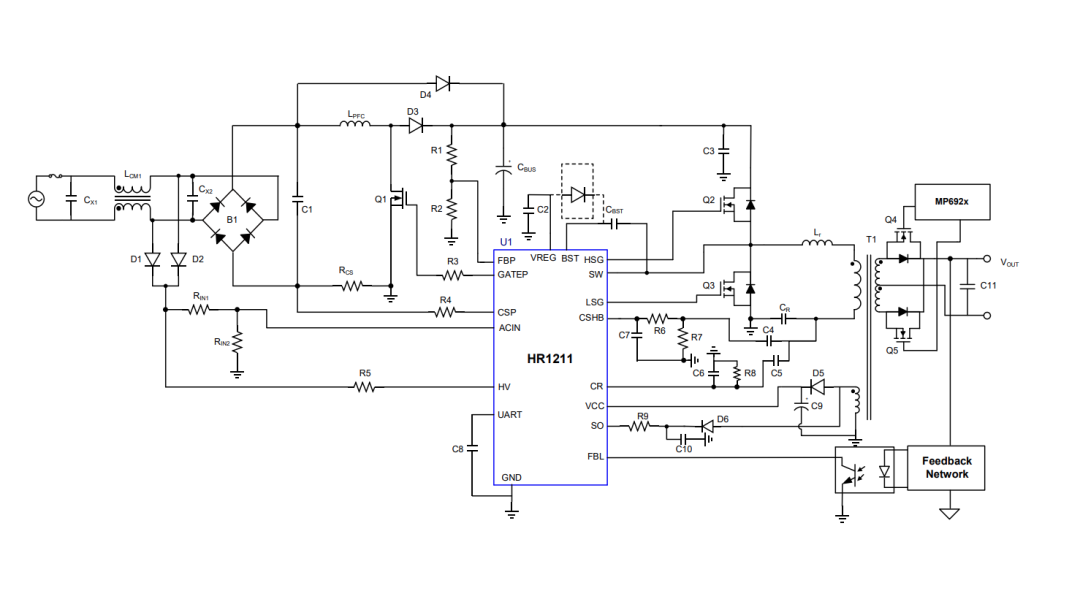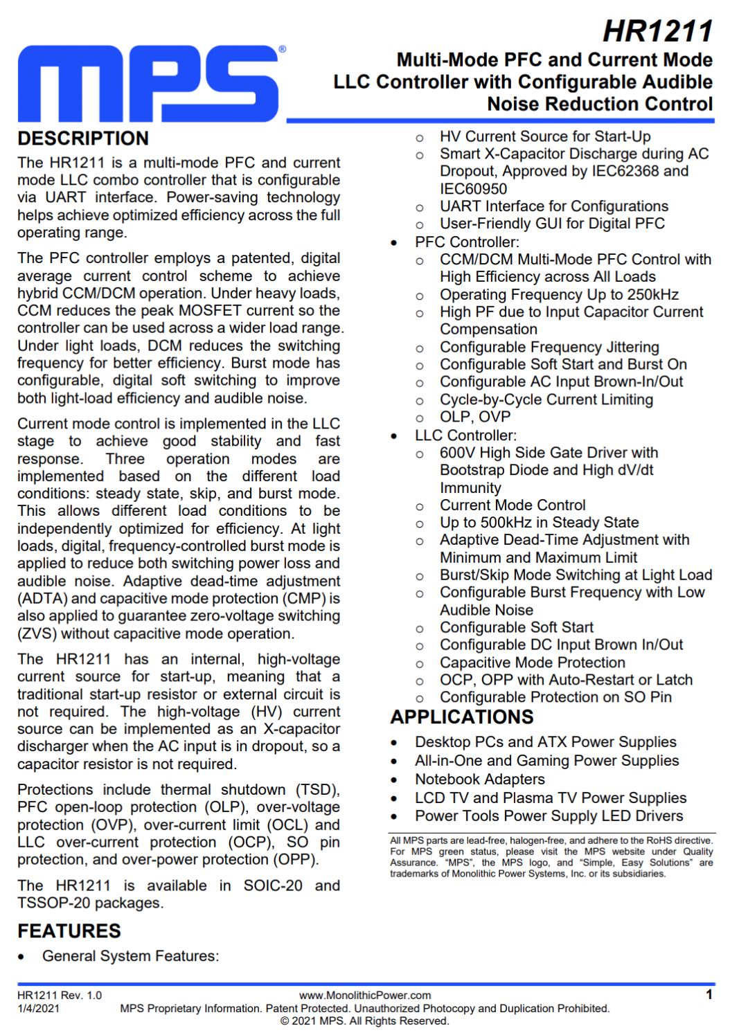 MPS HR1211将PFC控制器和LLC控制器整合到一个封装里面,其数字内核并可根据负载情况进行联动控制,获得更高的轻载效率。