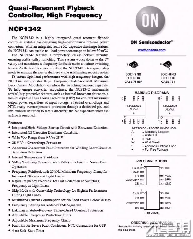 安森美NCP1342是一颗高频初级PWM控制器,内置主动X2电容放电和多重完善的保护功能。
