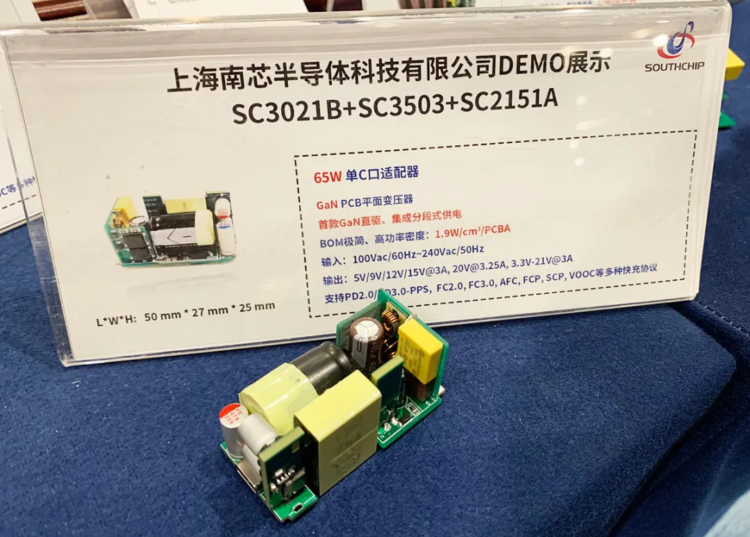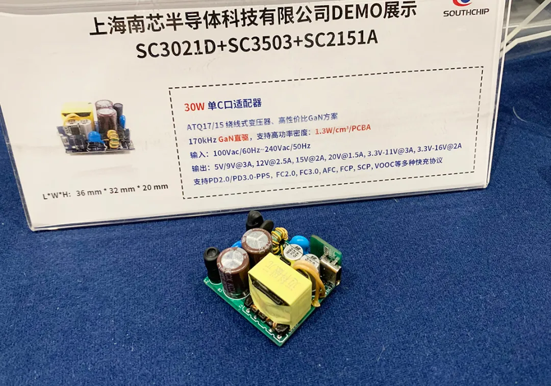基于南芯SC3021B+SC3503+SC2151A的芯片组合开发的65W单口平面变压器氮化镓快充方案,搭配英诺赛科INN650D02氮化镓功率器件。