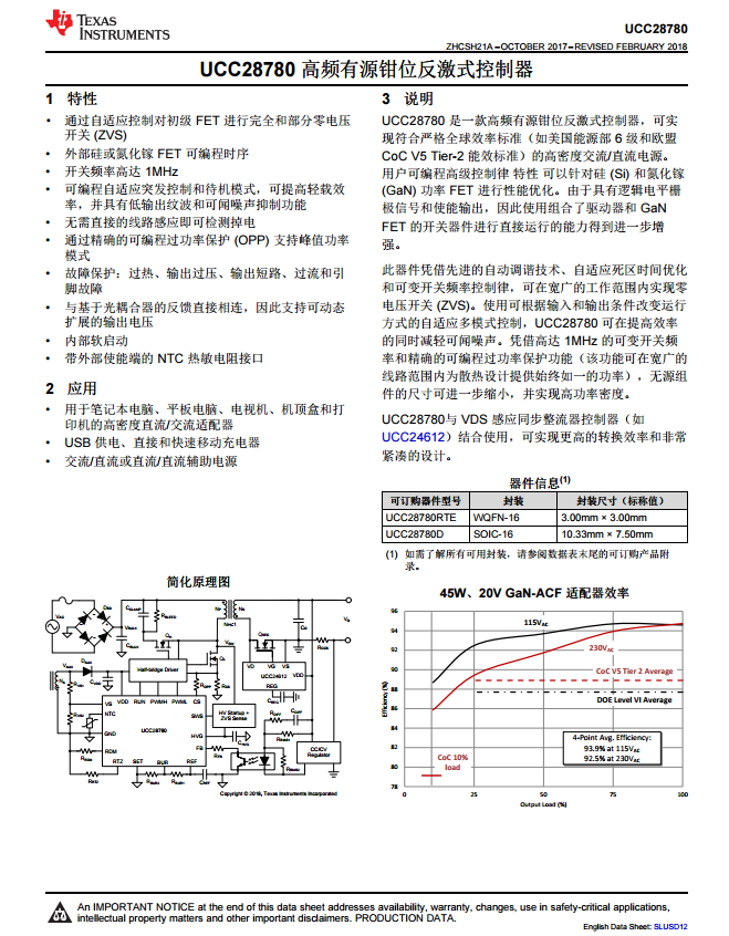 TI德州仪器UCC28780是一款高频有源钳位反激式控制器,可实现符合严格全球效率标准(如美国能源部6级和欧盟CoC V5 Tier-2能效标准)的高密度交流/直流电源。