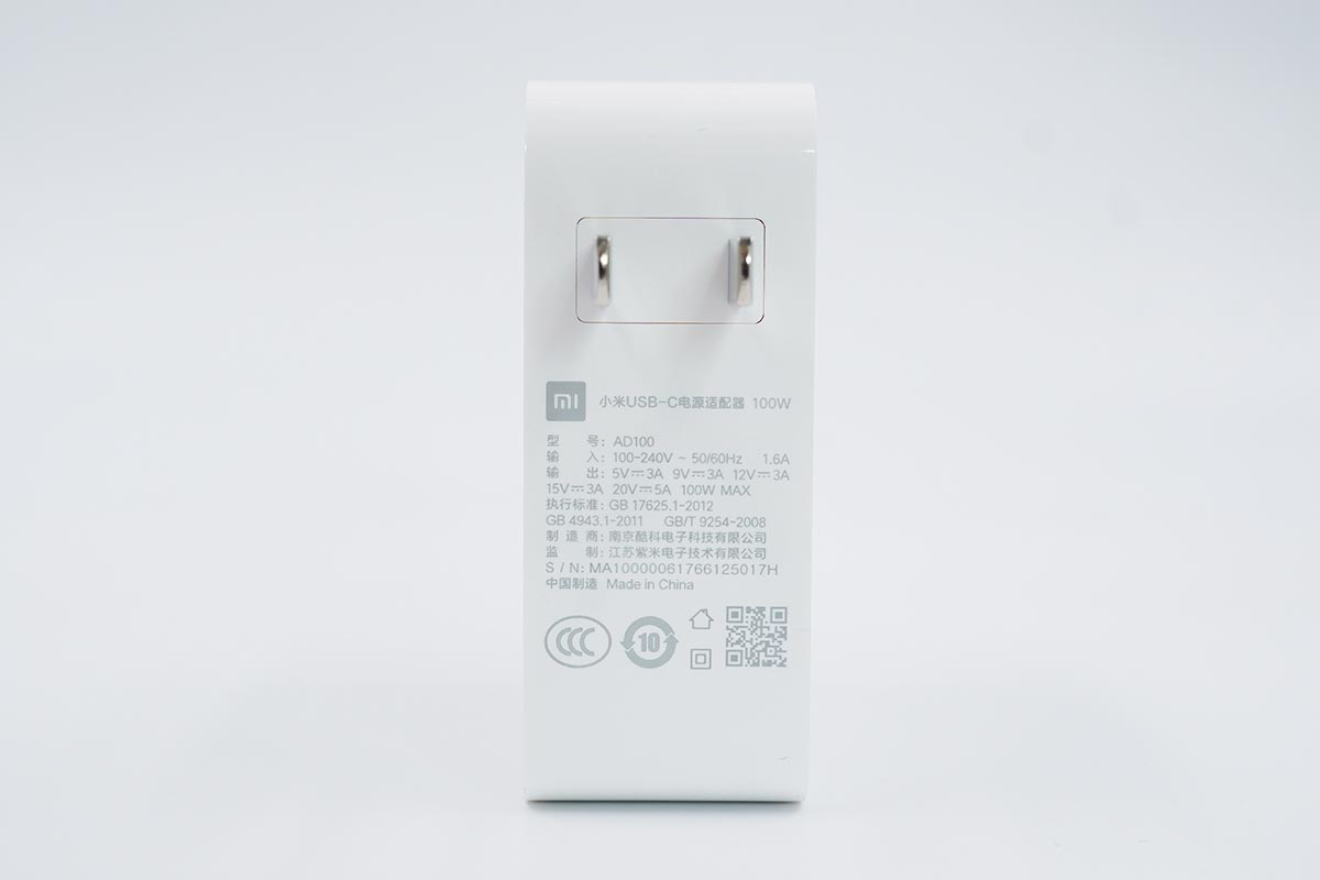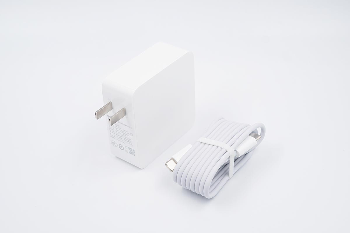 小米的这款100W充电器采用常见的白色外观配色,造型较为方正。虽然现在支持USB PD快充的笔电很多,但是标配这种分离式的PD大功率充电器还是很少见的。