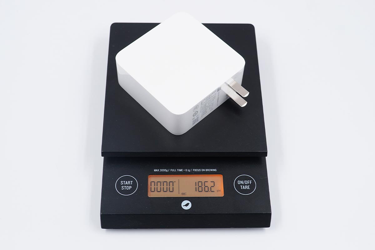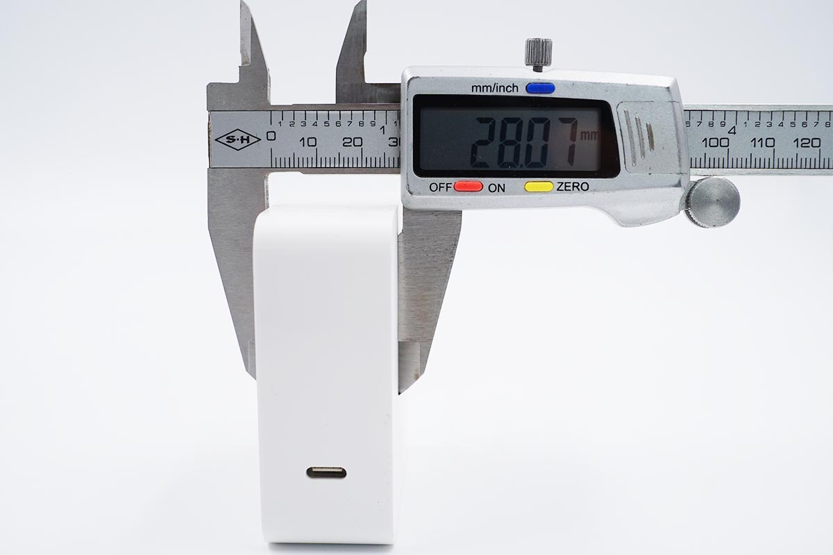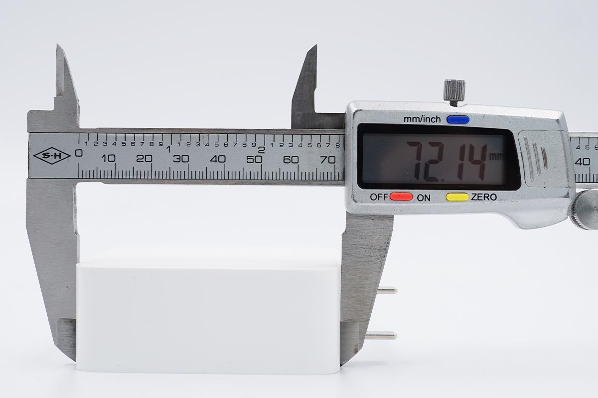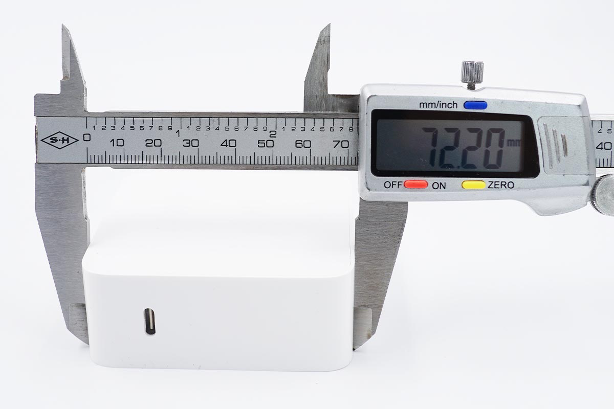充电器的三维参数约为72.2x72.14x28.07mm,充电器的体积约为146.20cm³,以最高输出100W计算,功率密度约为0.68W/cm³。
