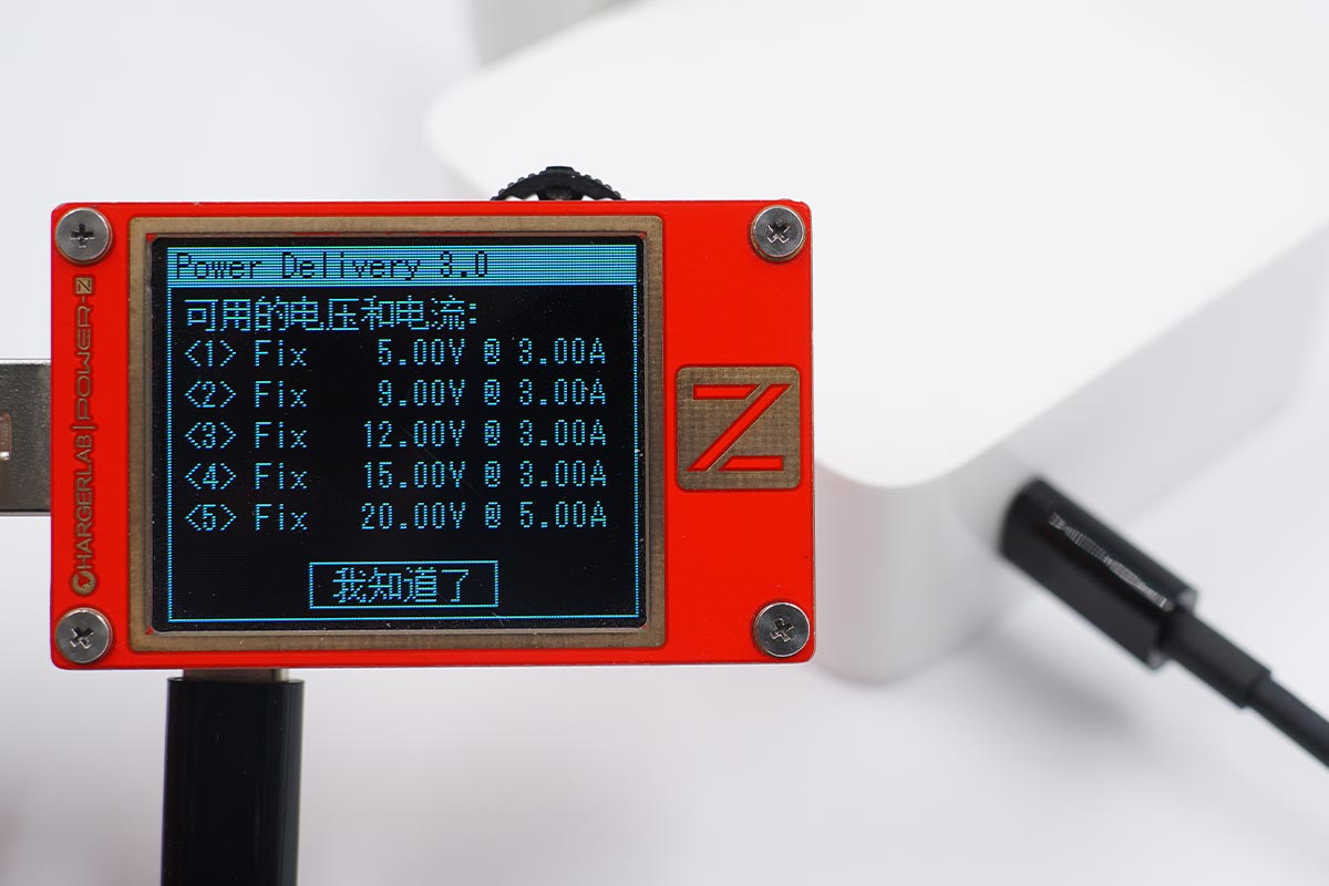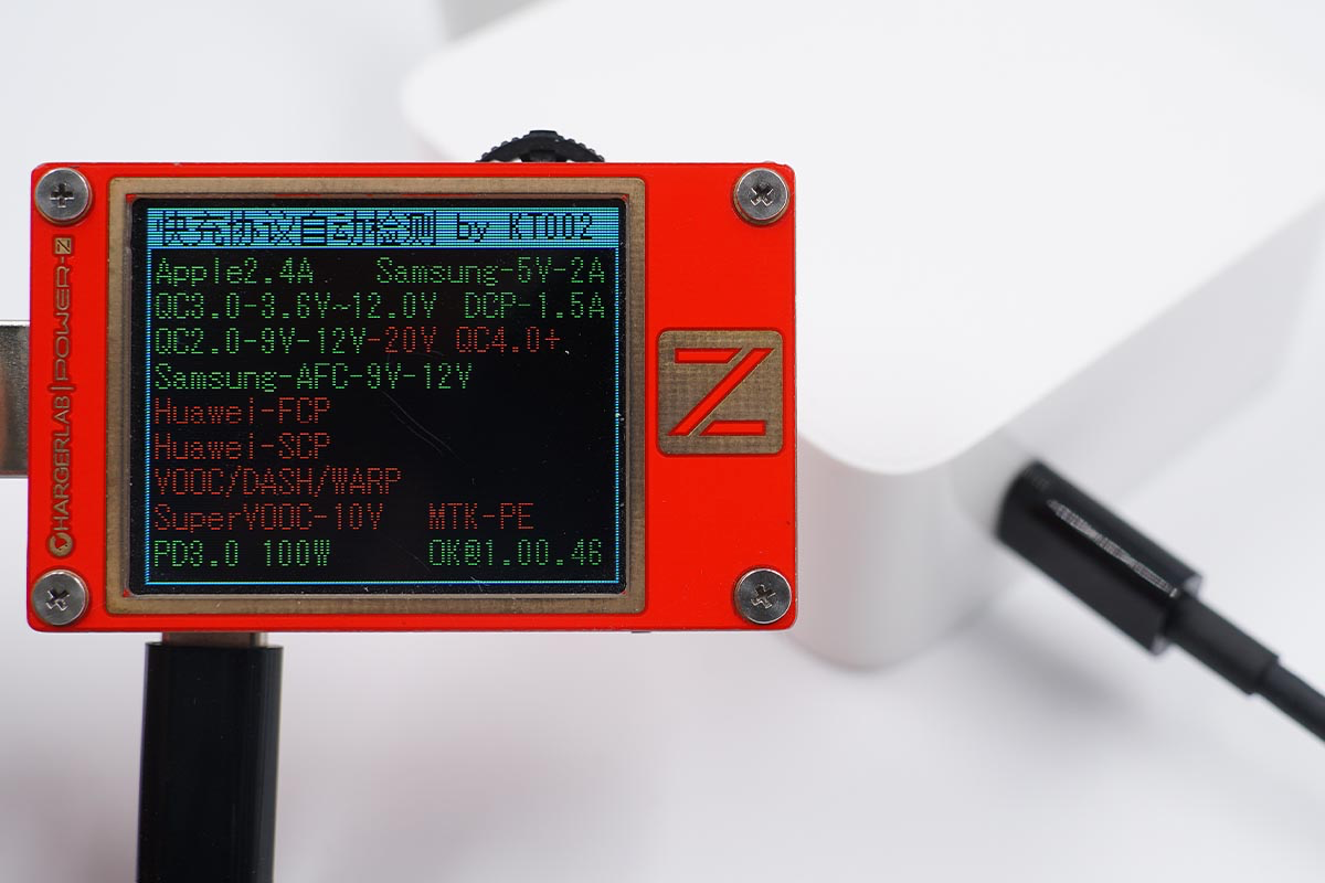 使用POWER-Z KT002读取充电器的快充协议,实测支持PD、Apple2.4A、QC2.0、QC3.0、AFC等快充协议。