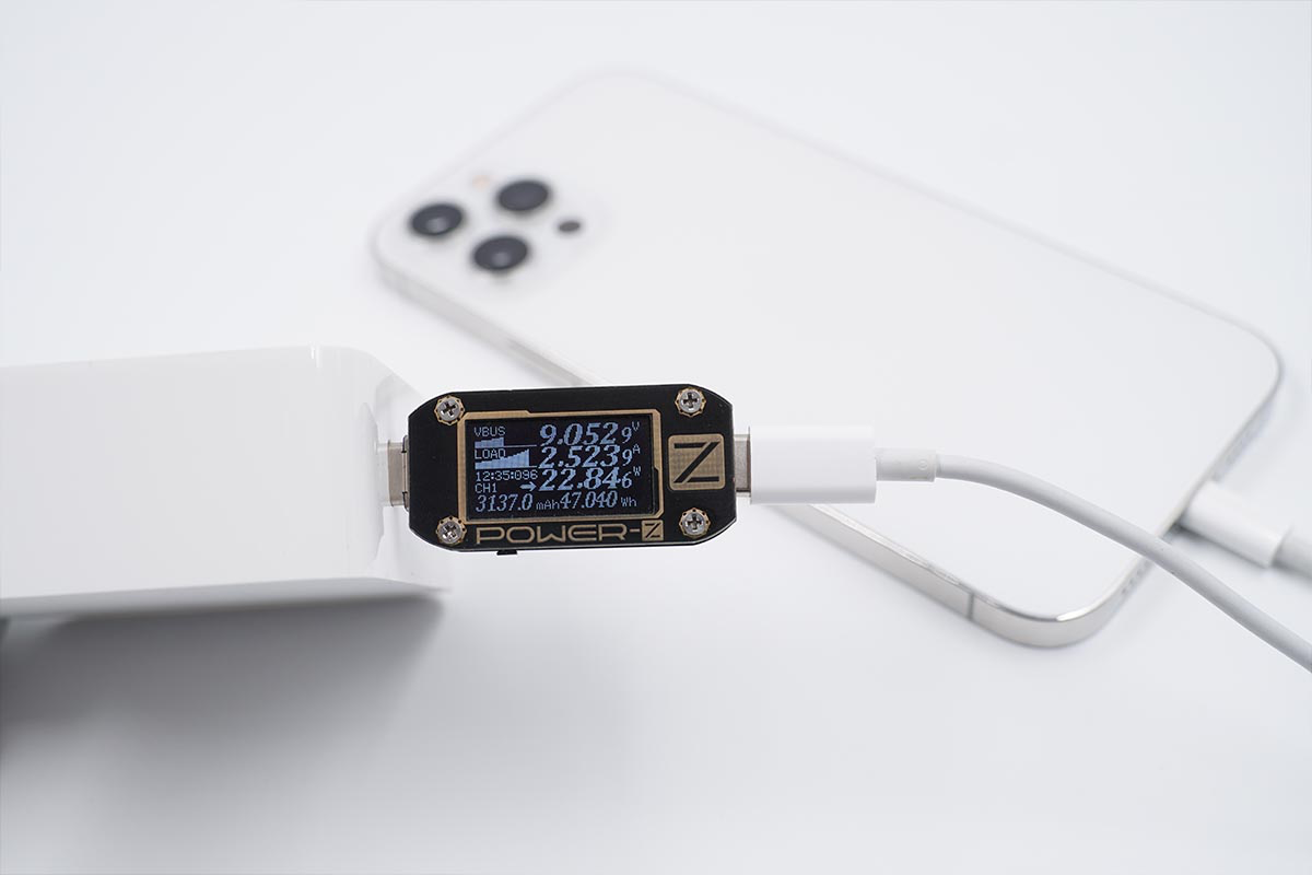 使用充电器为iPhone 12 Pro Max充电,功率为9.05V 2.52A 22.84W,成功握手PD快充协议。