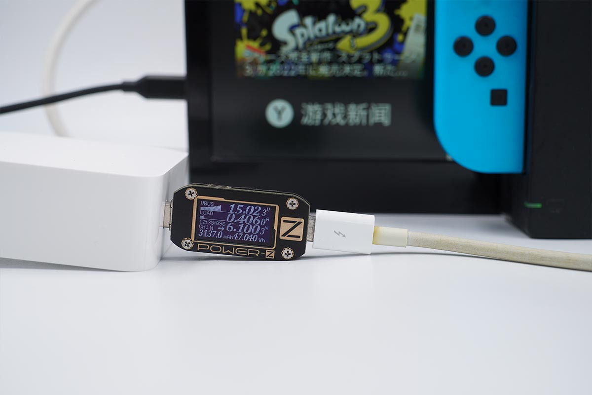 Switch带有特殊的底座TV模式,需要15V3A PDO才可以正常工作,非常挑充电设备。使用充电器为Switch底座供电,功率为15.02V 0.40A 6.10W,成功握手底座TV模式,底座正常对显示屏输出HDMI信号。