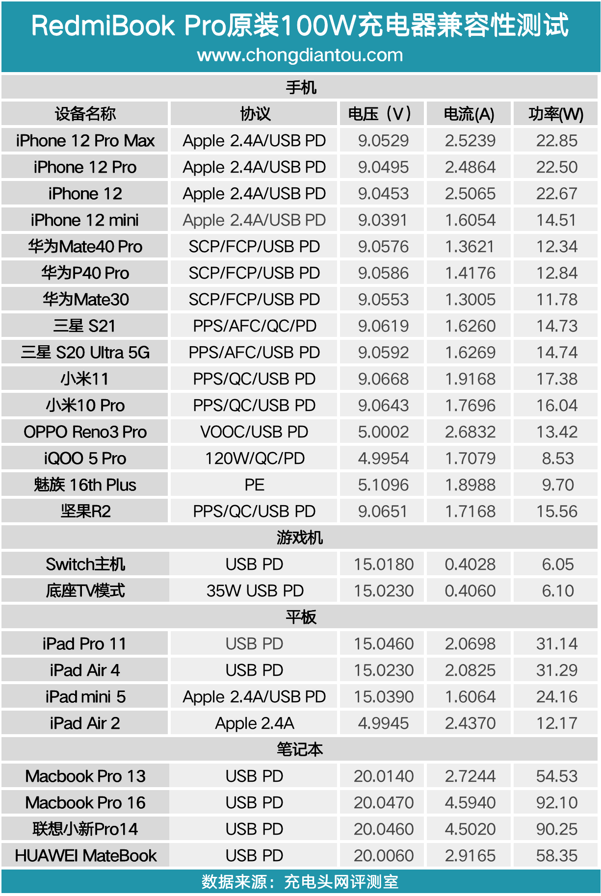 下面来看一下小米的这款100W充电器对于各个设备的功率支持情况如何。