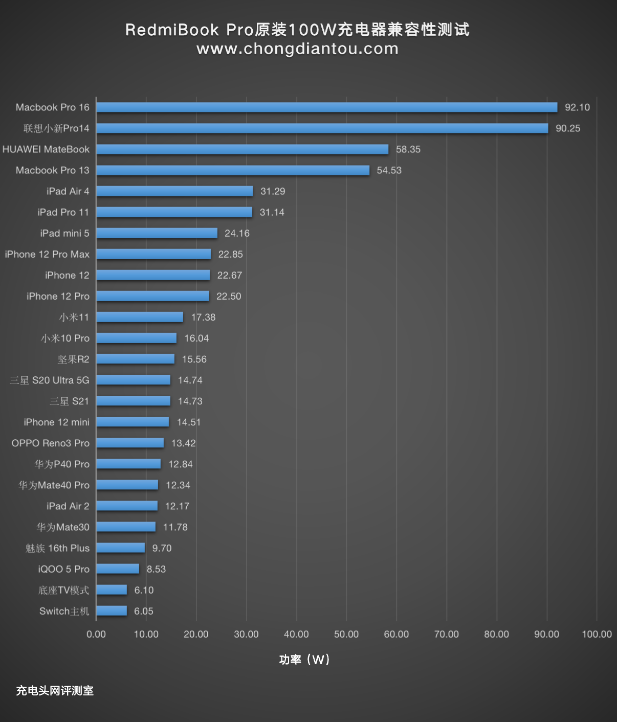 从整个柱状图来看笔记本的充电功率自然最高,达到了90W+,剩下的其他设备充电功率表现平常,均在11W-32W左右。