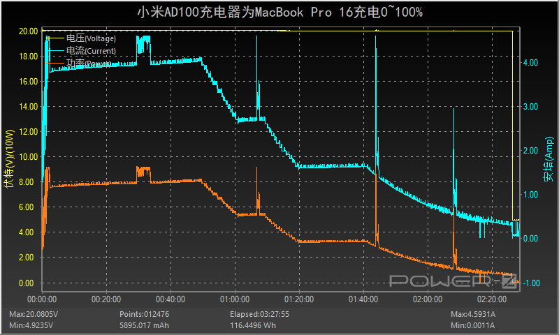 使用小米AD100 100W充电器为MacBook Pro 16充电,约49分前电流、电压以及功率平台均持稳定的输入状态,功率处于80W左右。随后功率和电流开始出现阶梯式的下降状态,功率在54W左右持续了约10分钟,33W左右持续了约21分。1小时41分后功率和电流逐渐下降直至充电结束,全程耗时约2小时26分,最高功率为20.03V 4.58A 91.92W。