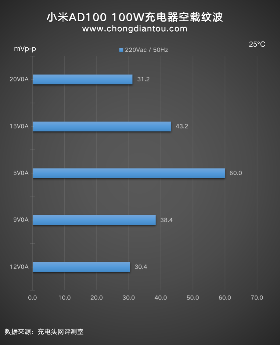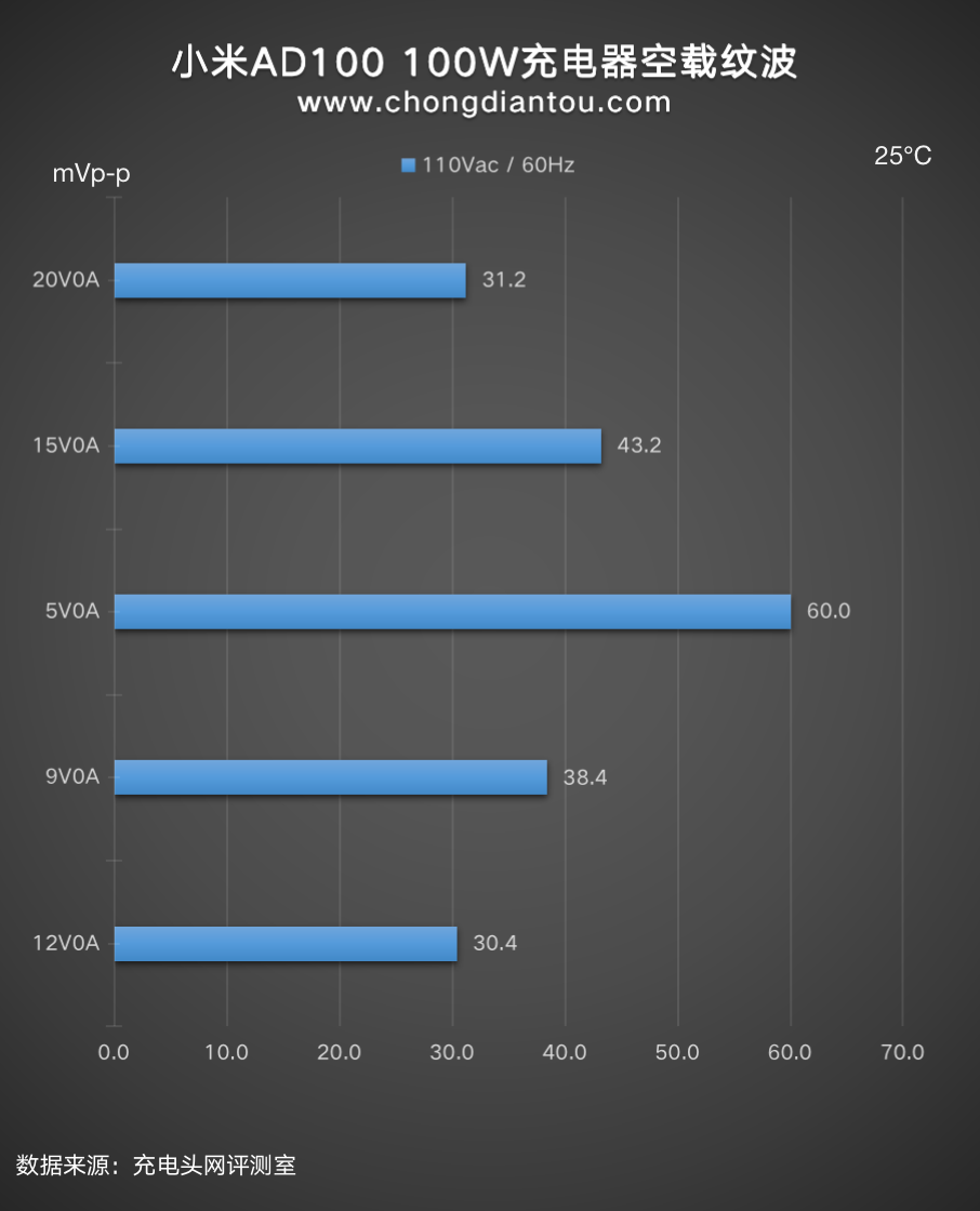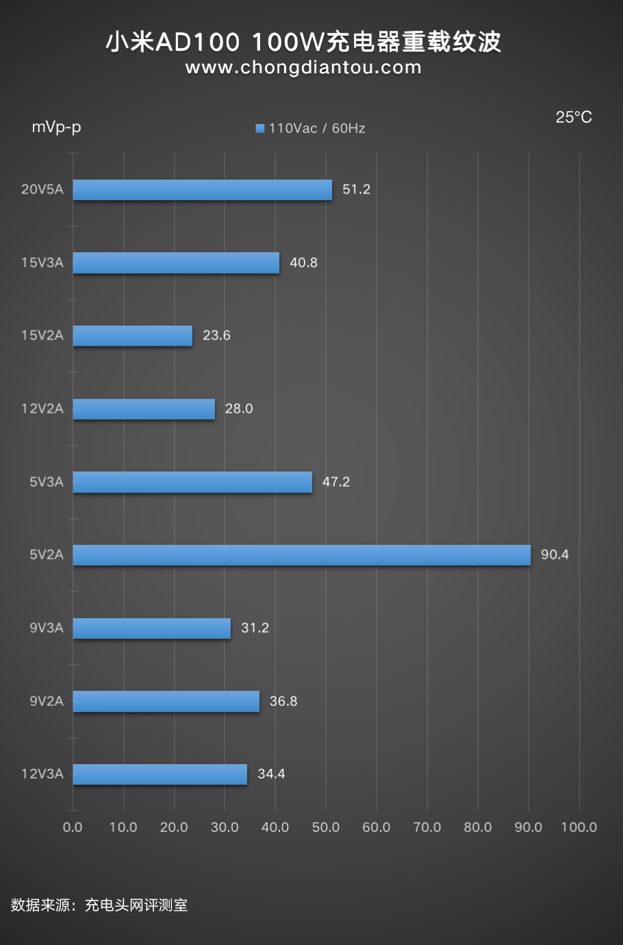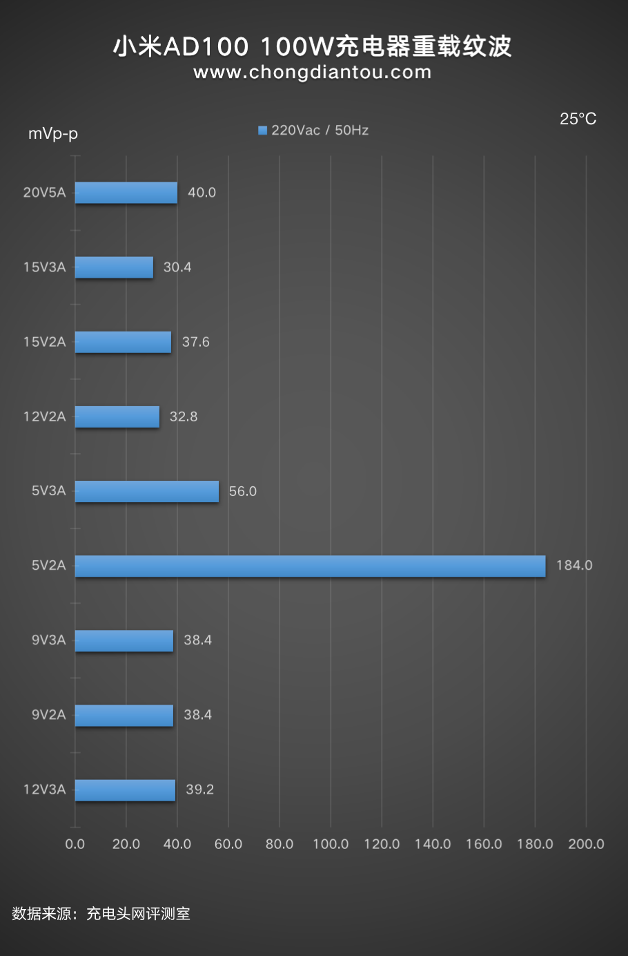 国家标准中充电器纹波要求是不高于200mVp-p,小米100W充电器在110V 60Hz、240V 50Hz输入电压下,所有输出功率纹波峰峰值均低于200mVp-p这个标准,表现不错。