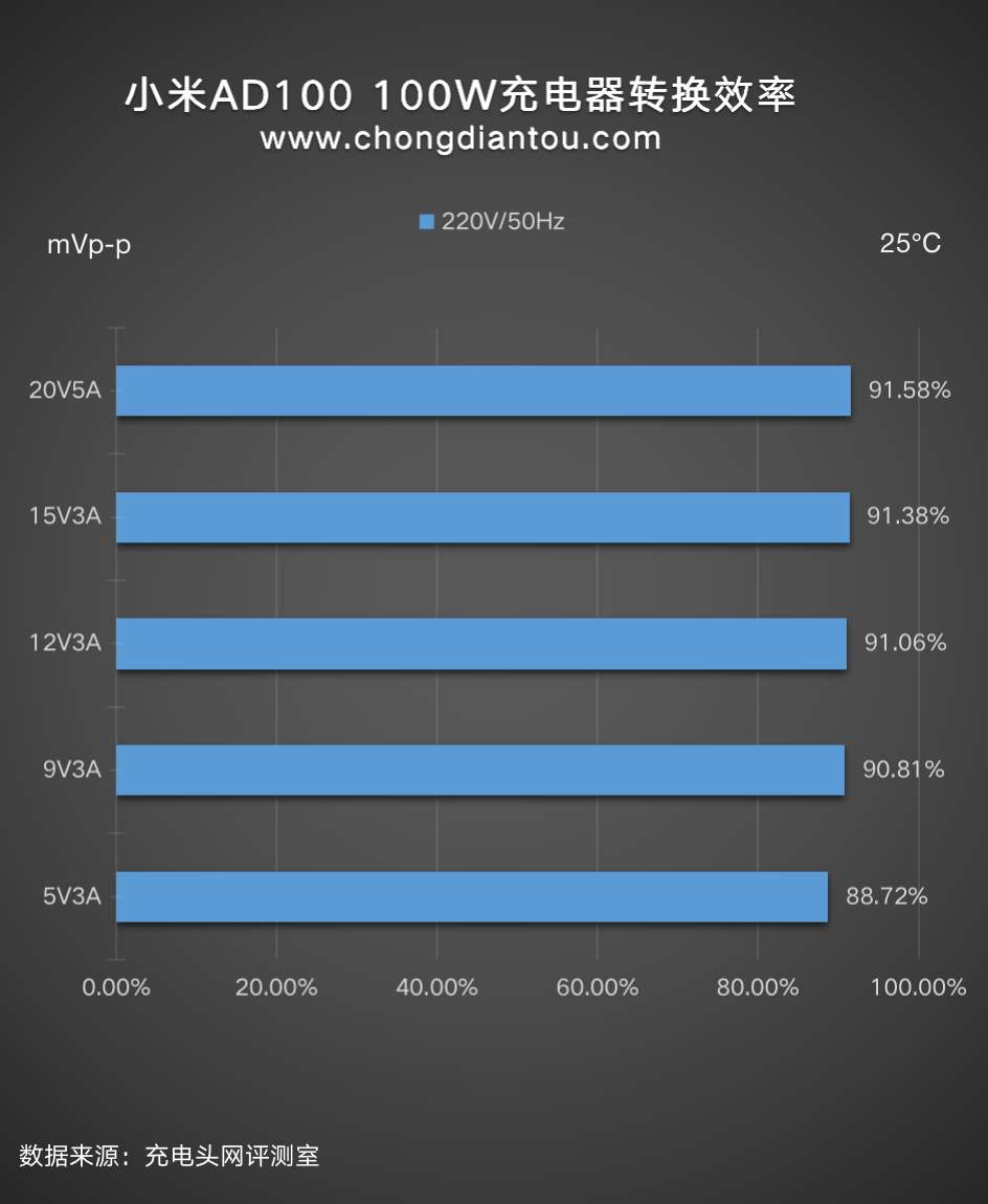 110V 60Hz下,充电器的转换效率从90.10%到91.26%不等。