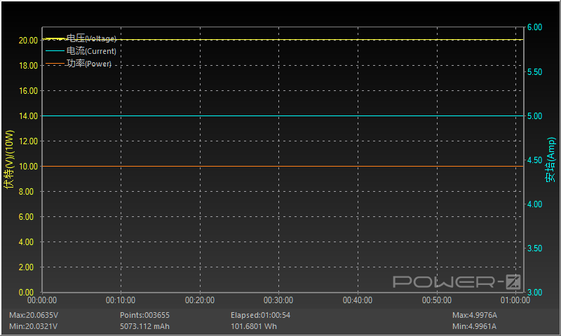 按照额定功率20V 5A 100W满载对充电器进行稳定性测试,测试时间为一小时,测试过程中电压值呈水平直线,无明显波动情况,长时间满载比较稳定。
