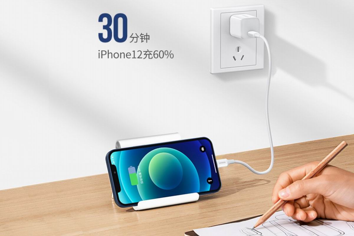 苹果从iPhone 12开始全系手机已不再赠送充电器,官方20W PD充电器体积比较大,自费购买的话价格高达145元人民币。还好iPhone 12支持通用的PD快充标准,绿联小金刚一样可以为他提供20W快充支持,使用绿联20W小金刚充电器搭配C94快充线,可以在30分钟为iPhone 12充至60%电量,为用户快速恢复续航能力。
