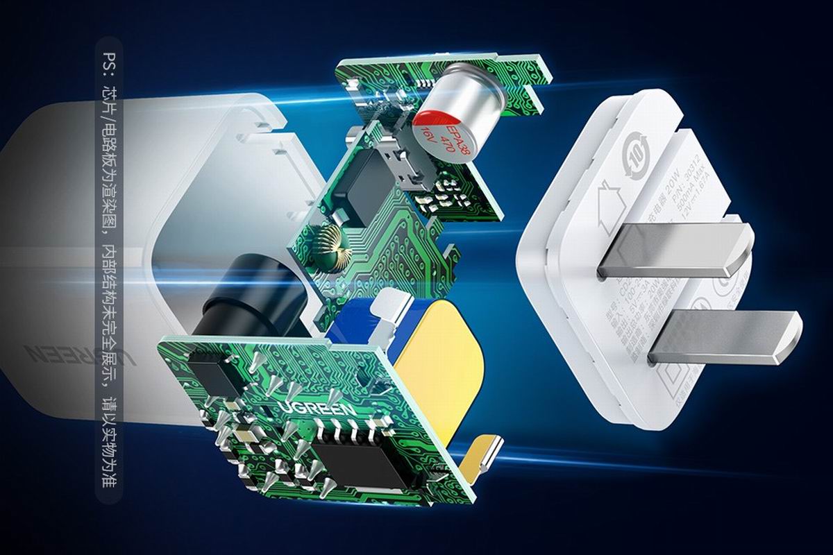 绿联20W迷你小金刚采用立体堆叠电路设计,三片PCB与元器件通过三维排布尽可能利用内部空间,并采用迷你变压器进一步缩减体积,最终在小方块内塞入可以支撑20W PD快充的所有器件。