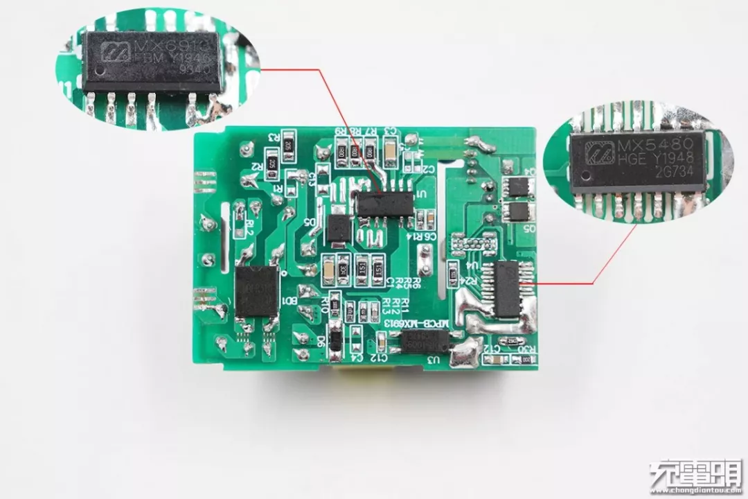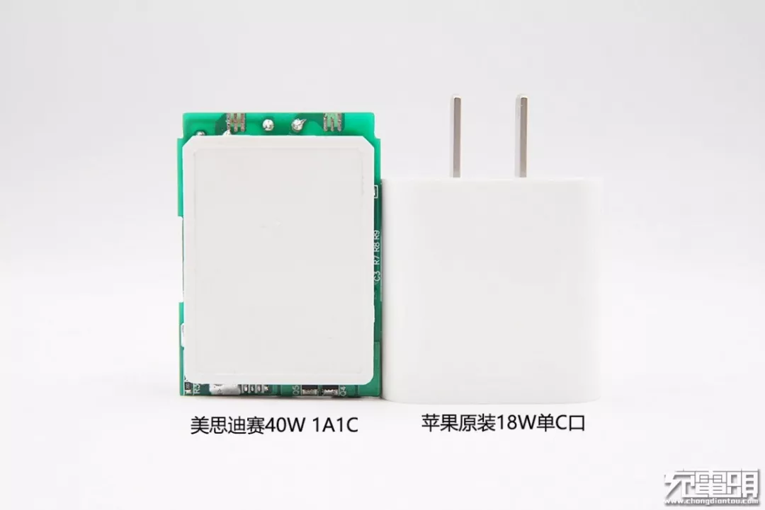 通过和苹果18W对比图片可以看出,美思迪赛方案在极小的尺寸内就实现高达40W的快充输出,如此精简的电路设计,可谓是黑科技满满。